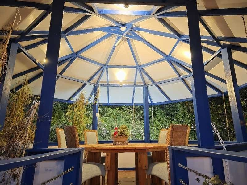 The outdoor areas are designed for relaxation and entertaining, featuring an 8 × 4 m overflow swimming pool with outdoor shower, a tea house set above a decorative fish pond, and a barbecue area with a covered bar, projector, screen, and wine cooler. Multiple sitting areas, a children’s play area with swings and a large playhouse, and a mature garden with fruit trees complete the setting. The property is pet friendly.