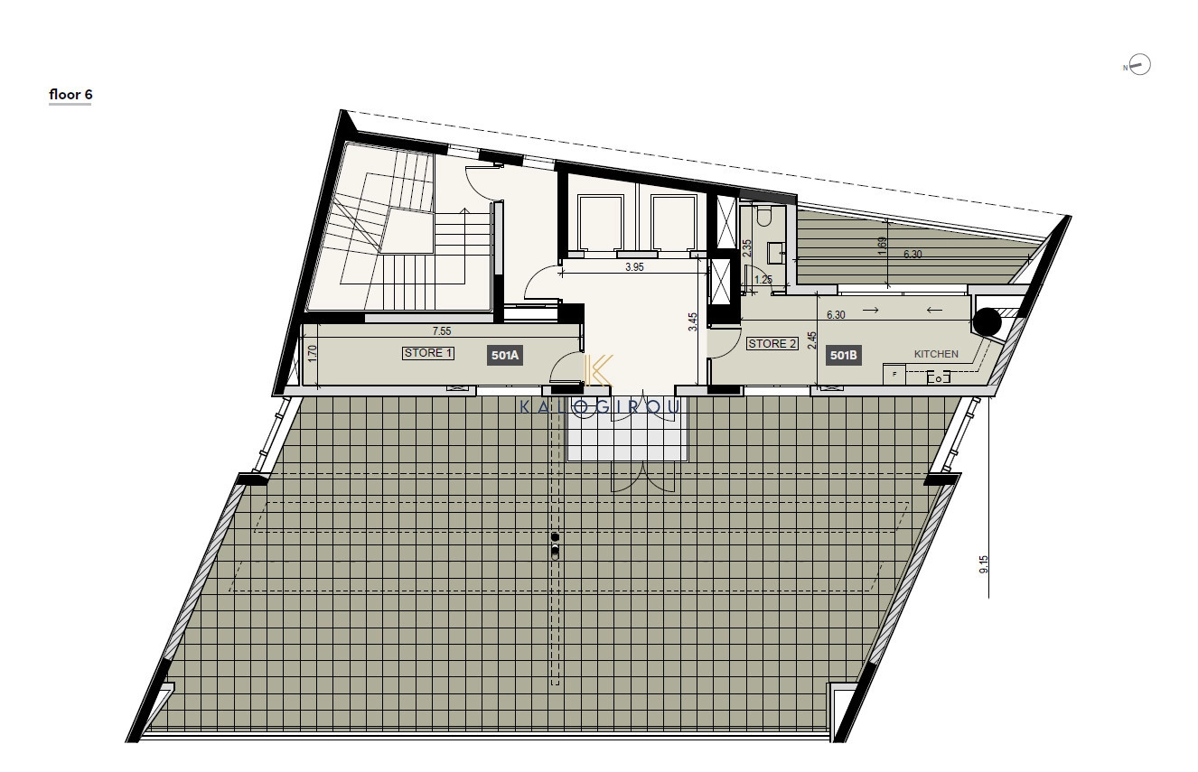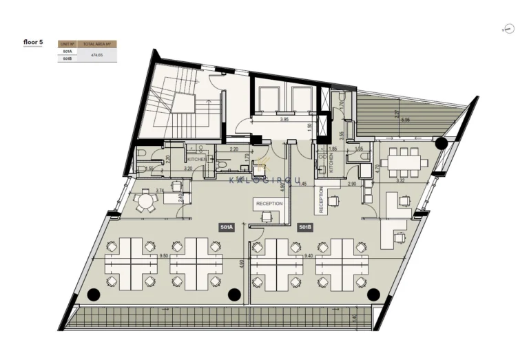 Offices for rent in Mesa Geitonia area, Limassol. The offices are situated on the fifth and sixth floor with total gross leasable area of 494 sqm. On the fifth floor there are 2 office units. Each office unit comprised of a reception area, open-plan workspace, enclosed office/conference room, kitchen, toilets, and a covered veranda. One the sixth floor there is a storage room for Office 501A and a storage room for Office 501B – along with a kitchen and toilet facilities, as well as a large common veranda area.