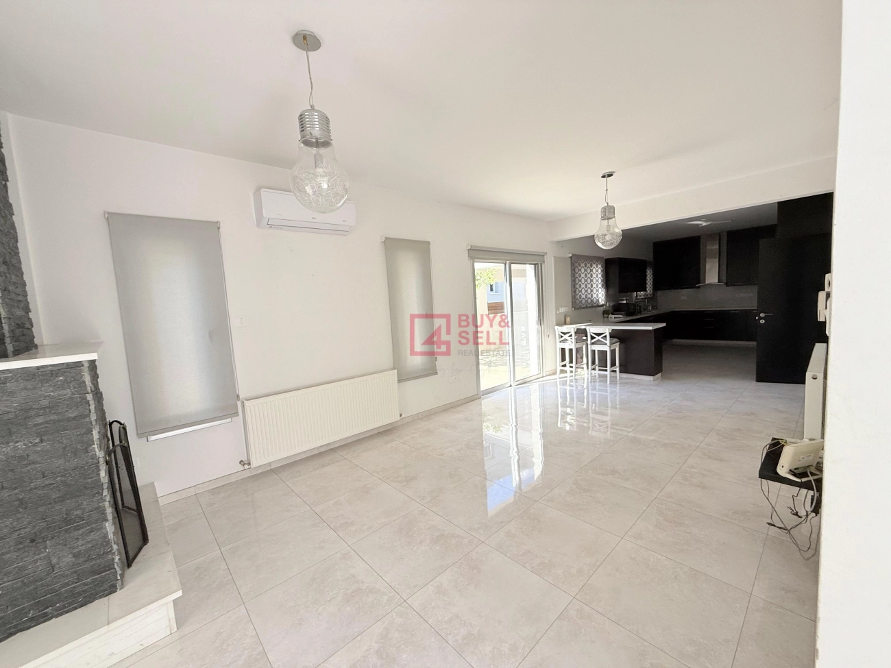 🔹Modern fully equipped kitchen with dining area and living room area with a fireplace