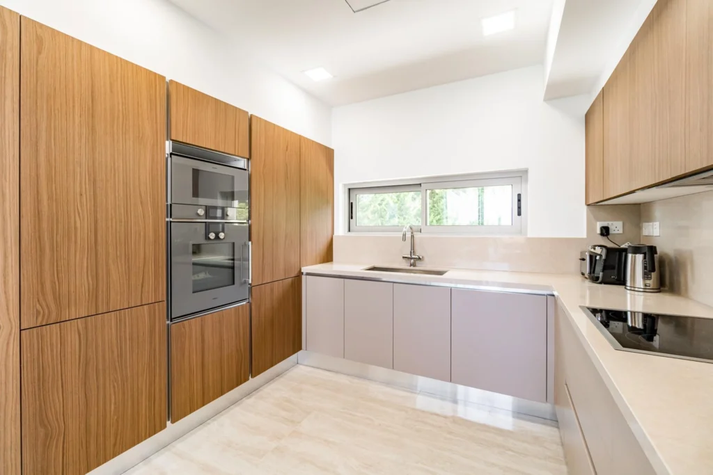 A four-bedroom villa with three bathrooms is available for rent in a residential complex ,200 meters from the beach. The house features panoramic windows, spacious terraces, a garden, and a private swimming pool, set on a large landscaped plot with sea and mountain views. The ground floor includes a living room with a fireplace and a fully equipped kitchen, while the second floor offers three bedrooms, one of which has an en-suite bathroom. The fourth bedroom with a window and its own bathroom is located on the lower ground level. The villa is equipped with a Smart Home system, VRV air conditioning, and underfloor heating. A covered parking space and a rooftop terrace are also available. The complex has 24-hour security.