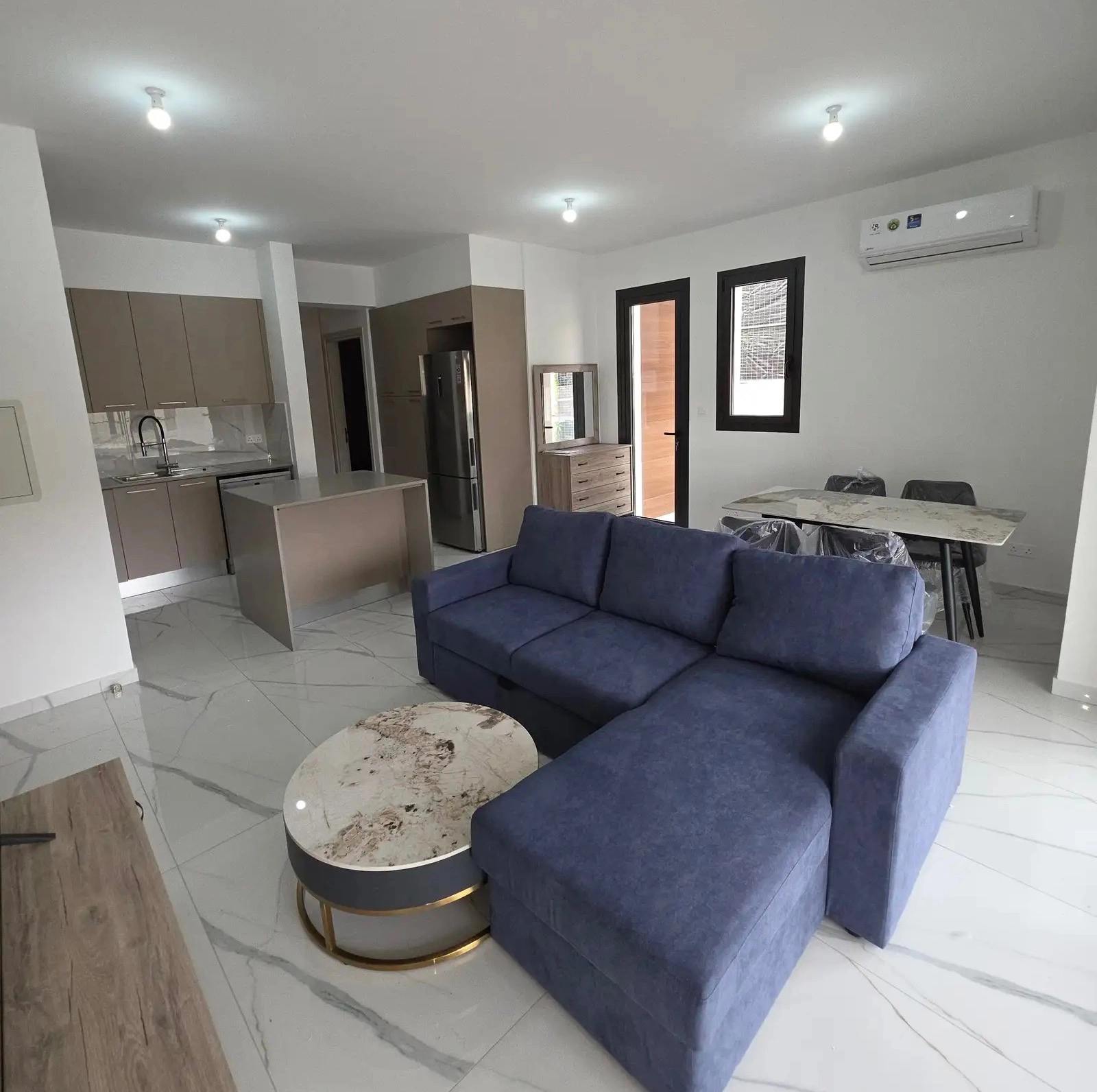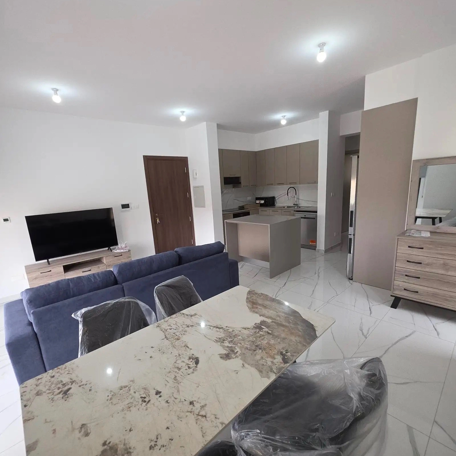 Two-bedroom apartment of 100 m2 for rent in Germasogeia, Limassol. The apartment includes 2 bedrooms, 2 bathrooms with toilets, a kitchen, a living room, a balcony and a pantry. The apartments are fully furnished and equipped with household appliances, including a refrigerator, dishwasher, oven, microwave, washing machine and dryer, air conditioning systems are installed in all rooms and underfloor heating throughout the apartment. The property is located in a new building built in 2025 with an elevator, belongs to energy efficiency class A, has not been used before, has a covered parking space, a spacious veranda. The apartment is located in a quiet hilly part of the Germasogeia area, providing a peaceful residential atmosphere with convenient proximity to the infrastructure and business areas of Limassol.