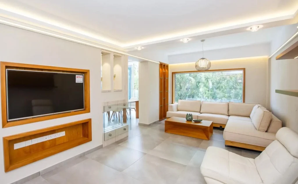 3 bedroom apartment for rent on the first line in Potamos Germasogeia, Limassol in a prestigious tourist area, just a few steps from the beach in Dasudi Park. The apartments include two bedrooms with bathrooms and fitted wardrobes, one outdoor area for sleeping or relaxing, a spacious living room with a fireplace, a dining room with panoramic windows and a modern open kitchen with an island. The apartment is fully furnished and equipped, has an Italian built-in kitchen, water-based underfloor heating, VRV air conditioning, smart home, new water supply and sewerage. The area is 125 m2, located on the 2nd floor. There is a covered parking, elevator, security system, fireplace, balcony and garden. Full air conditioning in all rooms. Energy efficiency: B+.