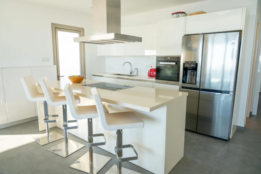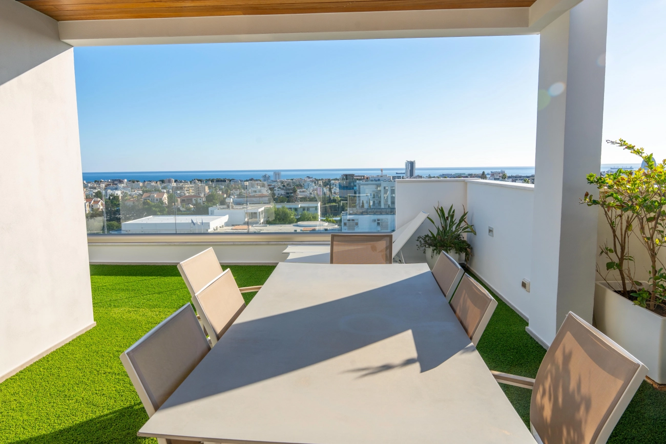 Three-bedroom penthouse for rent in Potamos Germasogeias Limassol, located on the third floor of a 2017 building in the prestigious Columbia district. The apartment is fully furnished, has an area of 160 m2 and includes three bedrooms, three bathrooms and an additional room on the roof level, which can be used as a guest room, office or staff room, as well as a private roof garden with panoramic views of the sea and the city. The penthouse is equipped with air conditioning in all rooms, alarm system, elevator, balconies, storage room and covered parking, is made in high quality and has energy efficiency class A. The facility is located just a few minutes from Kolonakiou, close to cafes, supermarkets.