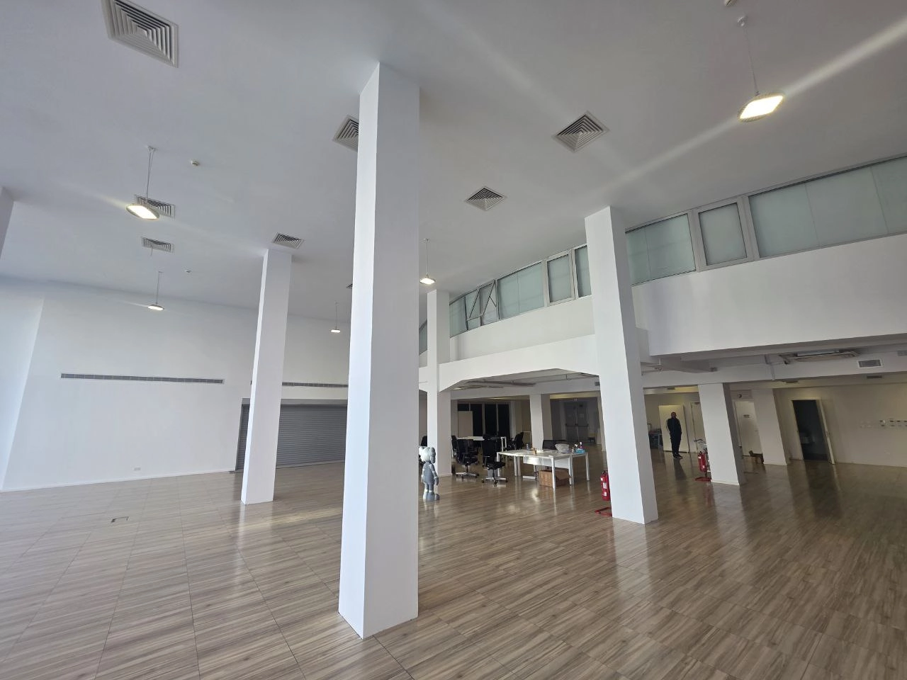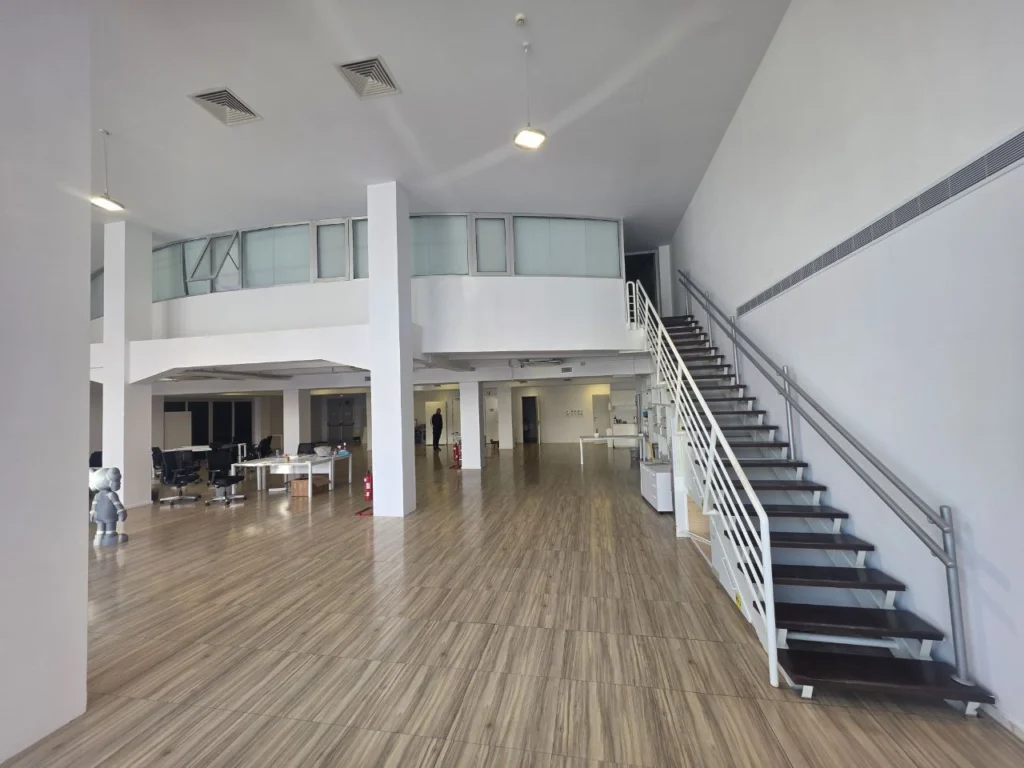 Commercial premises for rent in the area of Agios Athanasious, Limassol. The ground floor with an area of 477 m2 + mezzanine with an area of 338 m2 is available for rent. The space is ideal for showrooms, shops or offices, as well as gym. The space is equipped with modern systems — raised floors, intelligent lighting, DAIKIN air conditioners in all areas, four bathrooms, a server room, high ceilings and covered parking. Located in one of the most sought-after commercial areas of the city, with excellent visibility and convenient access.