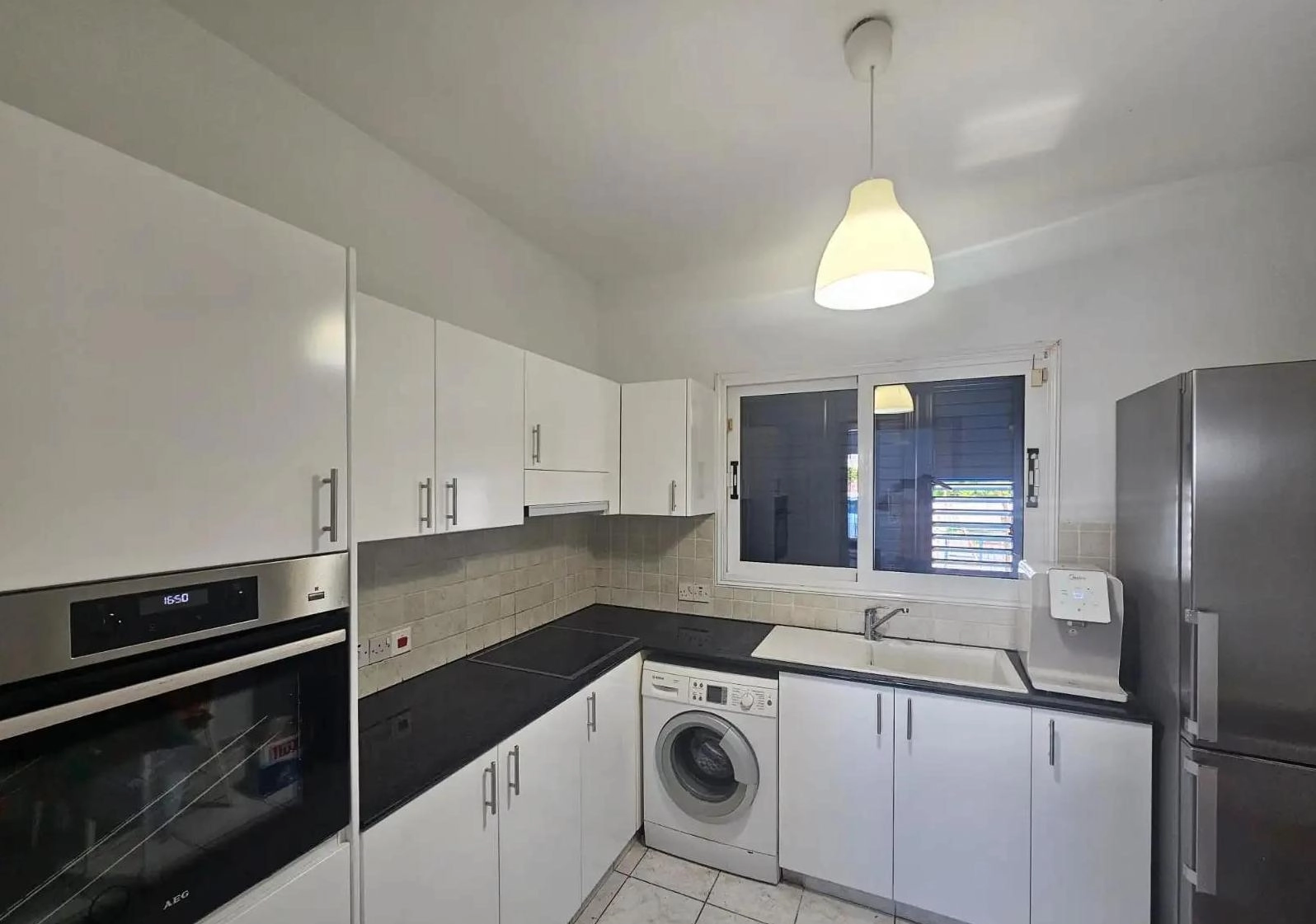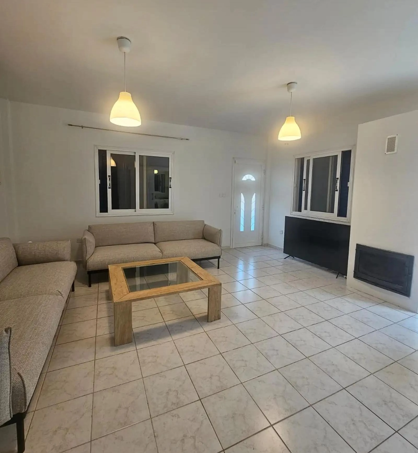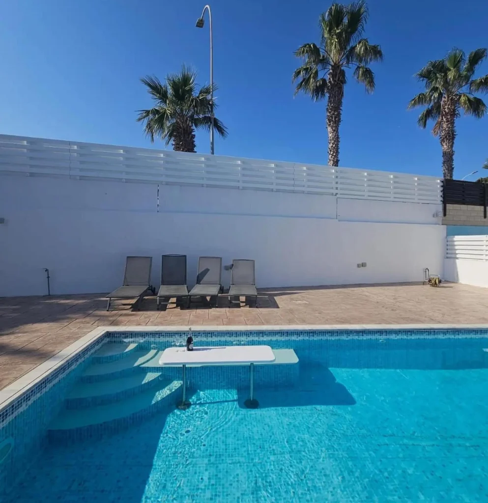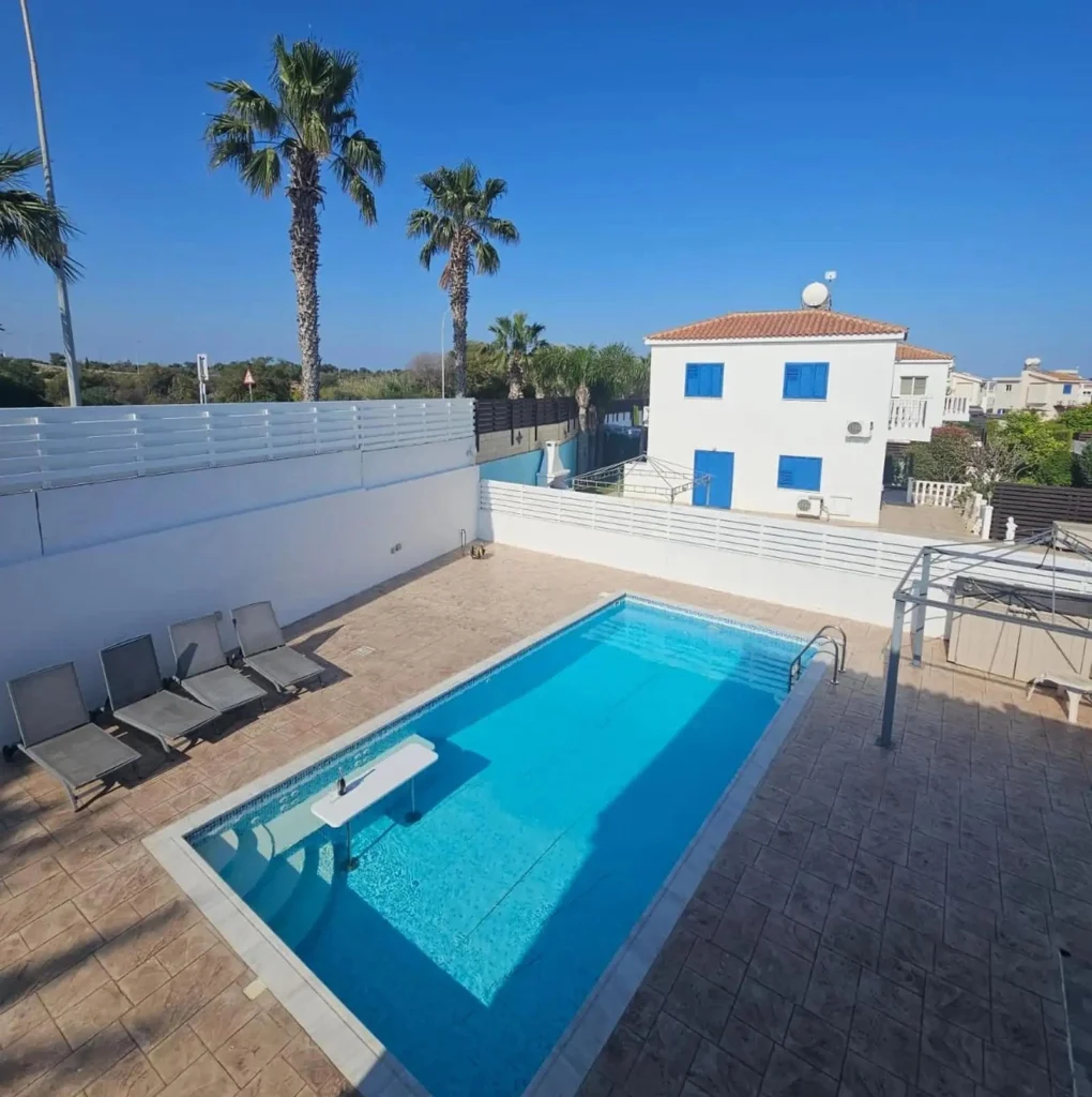 For rent a 3-bedroom house with a swimming pool and a fireplace in the area of Agia Thekla, Famagusta Within walking distance from the beach. The house is located on the territory of a small complex of 11 houses at a dead end of a private road. There is a shower in the outdoor pool with hot and cold water. The house is furnished and equipped with household appliances, there is a brand new TV and sofas, an oven, an extractor hood and a water purifier. The kitchen has been recently renovated and the house has been painted. There are 2 sheds (1 metal, 1 small under the stairs)