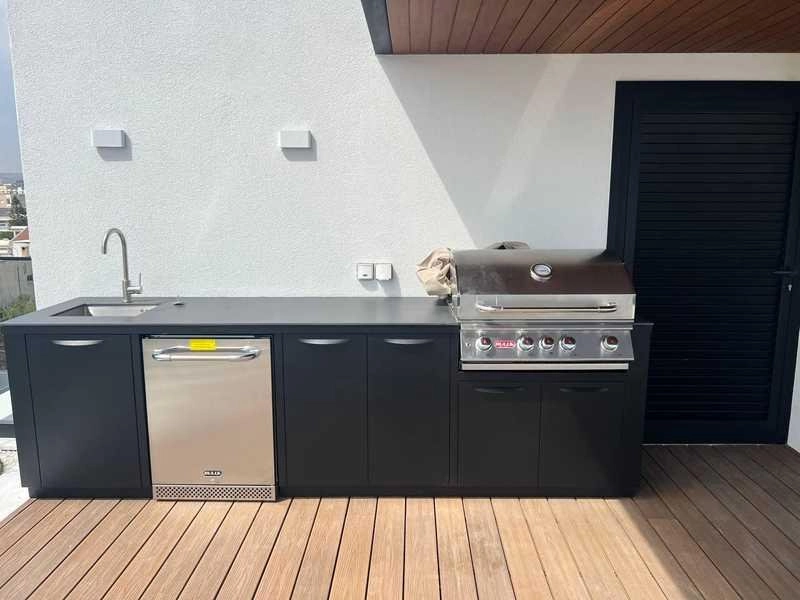 The fully equipped kitchen features premium built-in appliances, including a Liebherr double-door refrigerator and Bosch oven, microwave, dishwasher, and washing machine.