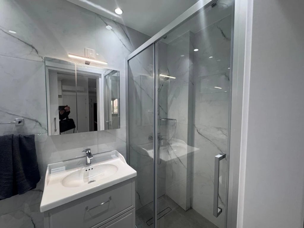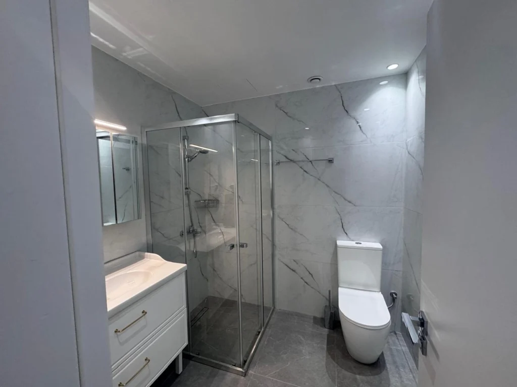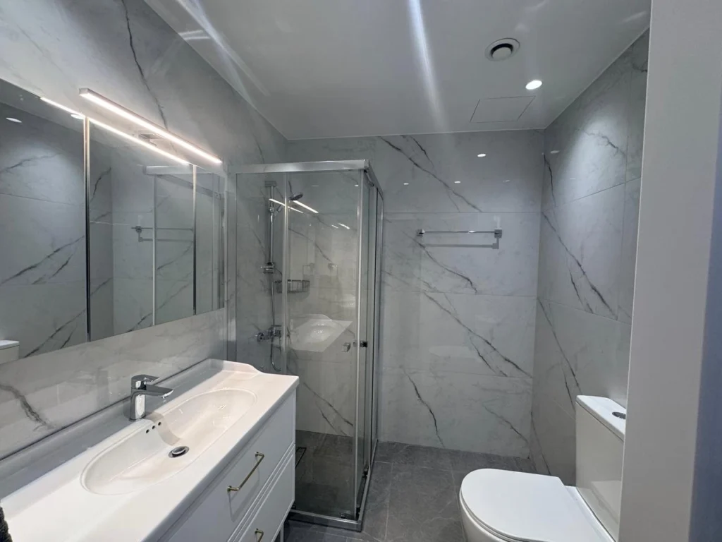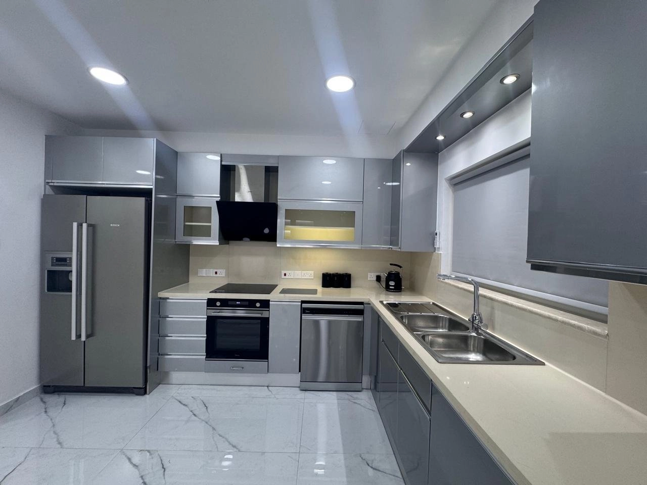 The apartment features three spacious bedrooms, each with its own en-suite bathroom, ensuring privacy and comfort for all residents. The open-plan kitchen, living, and dining area is thoughtfully designed for modern living and enhanced by a suspended ceiling with spotlights and LED lighting, creating a bright and elegant atmosphere.