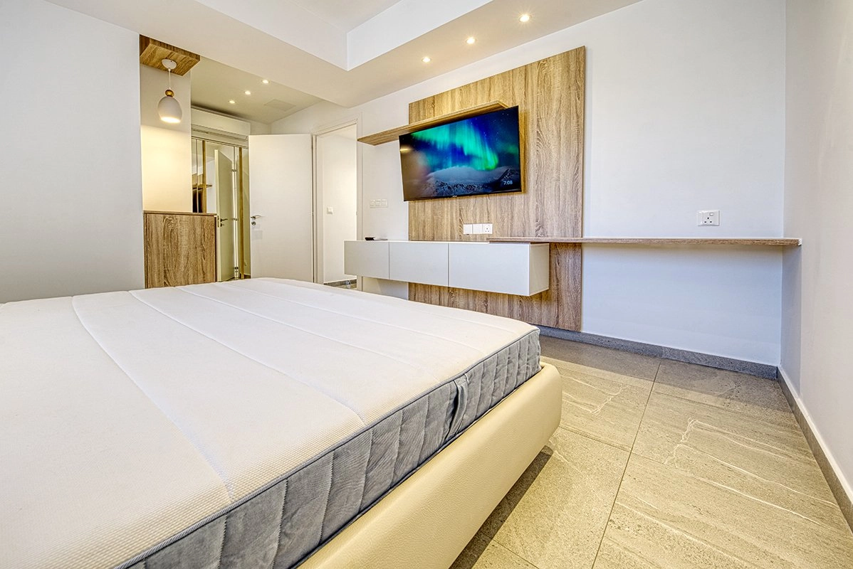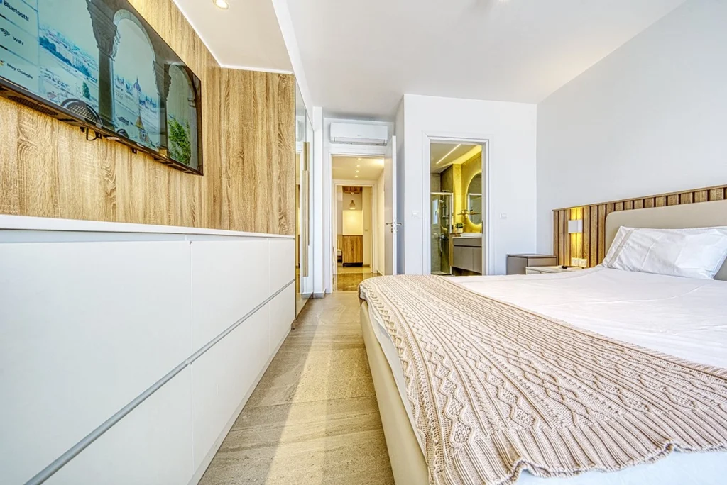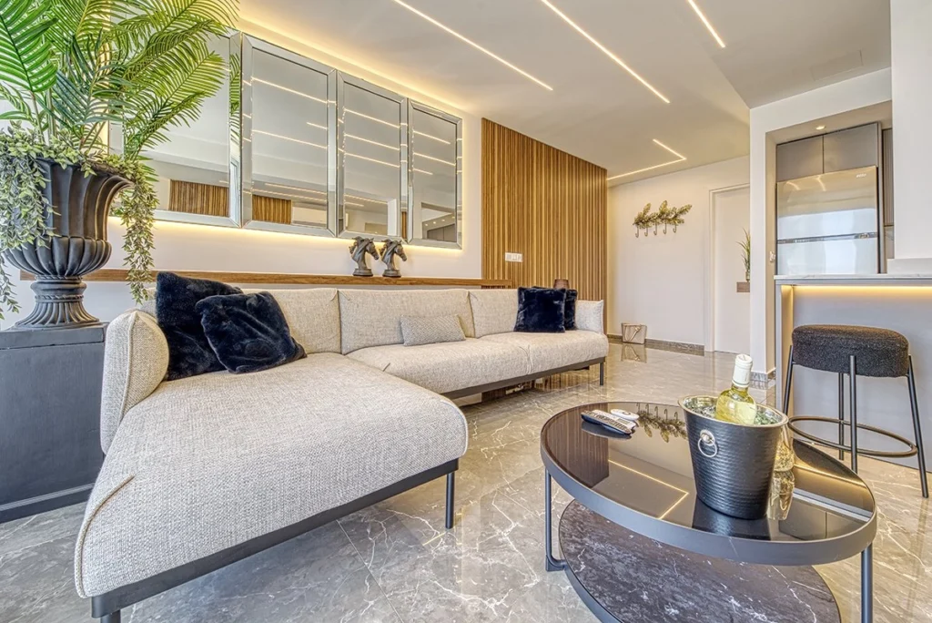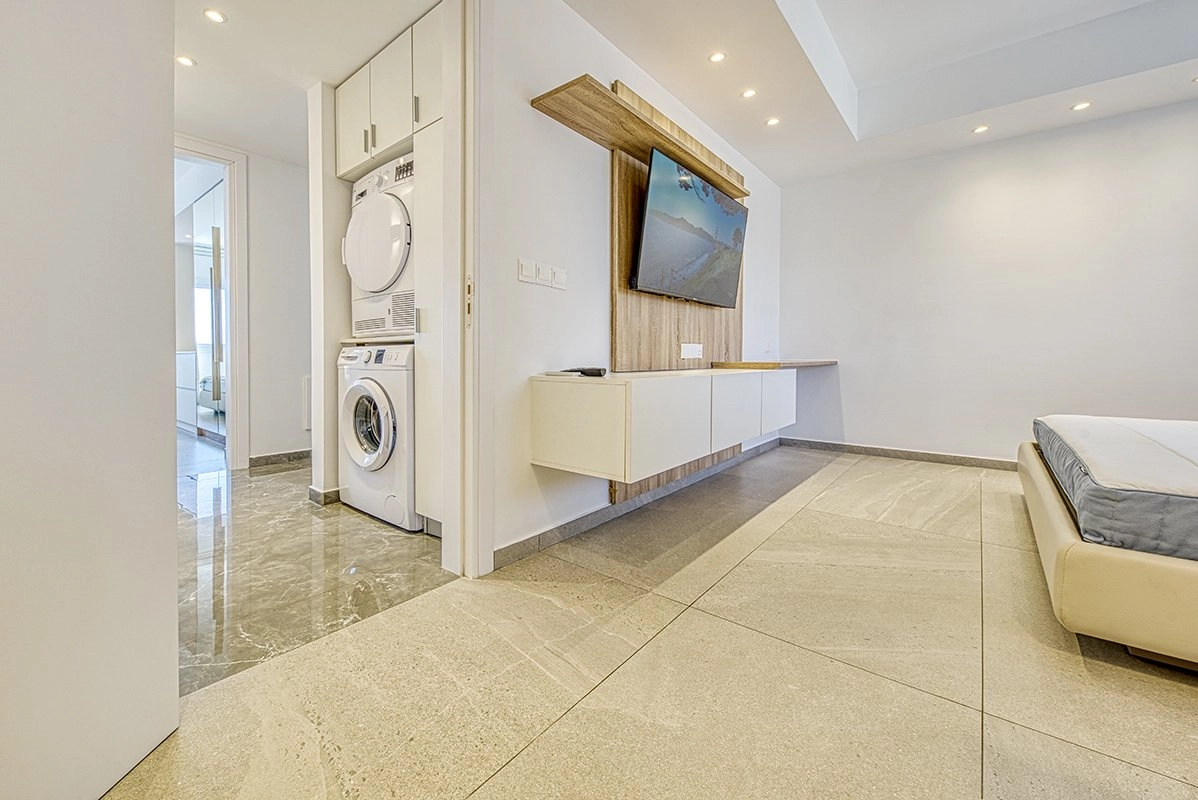 The apartment offers a beautiful living space facing the sea and blends elegant, functional design with high-end interiors and ambient lighting. Floor-to-ceiling glass doors and windows open onto a large private balcony, creating a sense of openness, light, and seamless indoor–outdoor living. The property is fully furnished with high-quality furniture, décor, and premium electrical appliances, surrounded by all essential amenities and beachfront lifestyle attractions.
