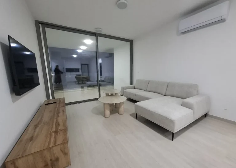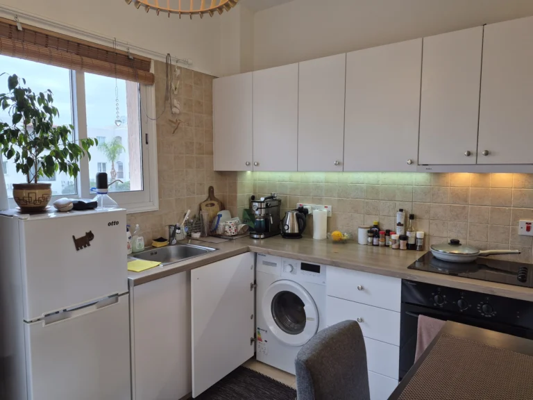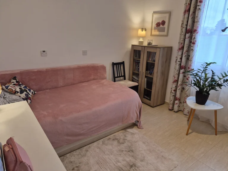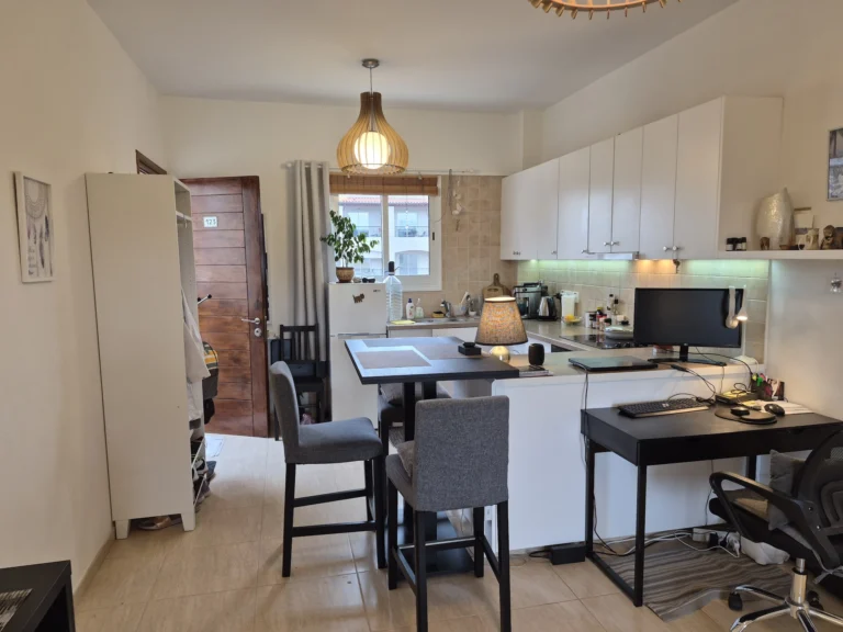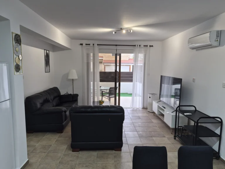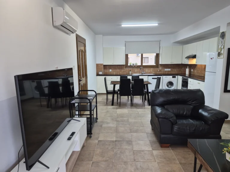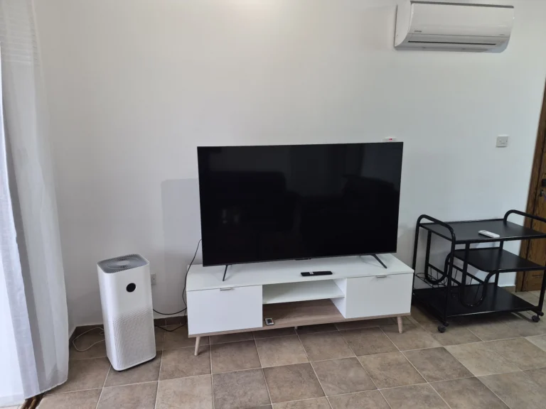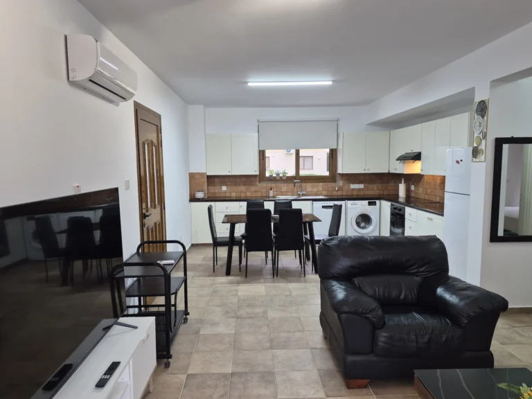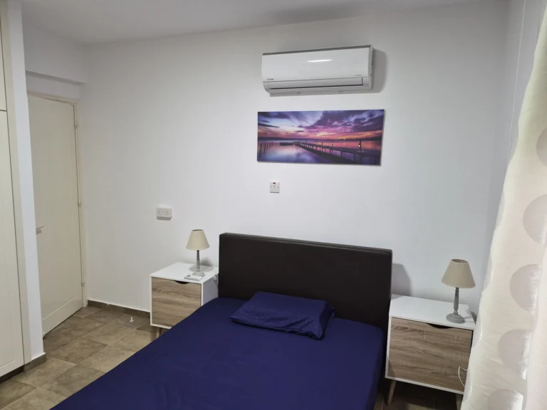A cozy one-bedroom apartment is for rent in Larnaca, located in a convenient area near Finikoudes Beach, the Medieval Castle, and the Church of Saint Lazarus. The apartment is decorated in warm tones and features a living room with a sofa and smart TV, a bedroom with a double bed, a fully equipped kitchen, and a private balcony. It also includes a washing machine and free parking.