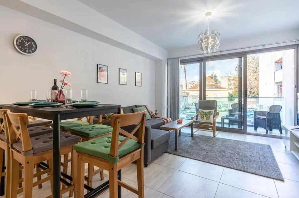 A two-bedroom apartment is for rent in Larnaca. It features a spacious living room with soft seating and a smart TV, a dining area, and a fully equipped kitchen with appliances. The main bedroom has a king-size bed, and the second bedroom has two single beds, both with air conditioning. The apartment includes a bathroom and a guest toilet, a private terrace with furniture, and a parking space. It is conveniently located close to shops, transport, and the city’s main attractions.