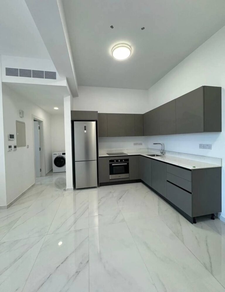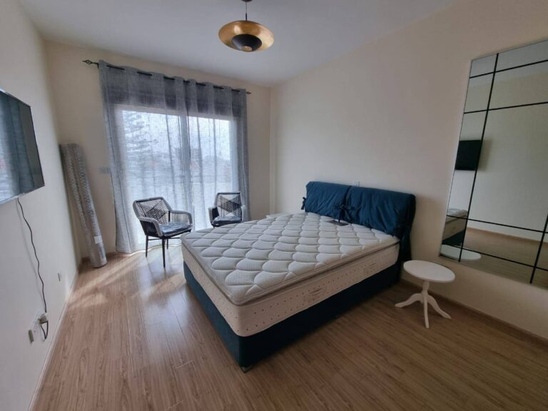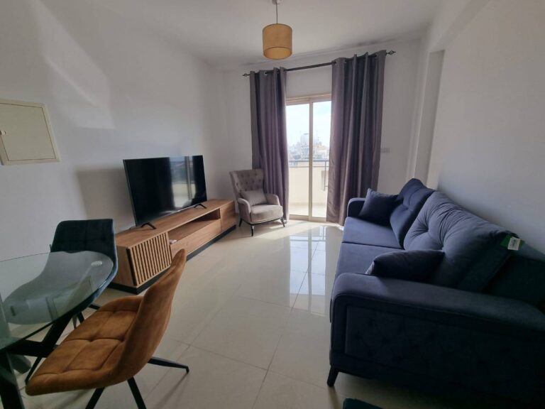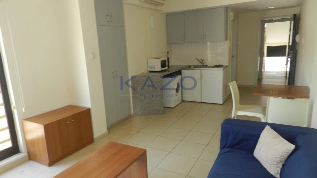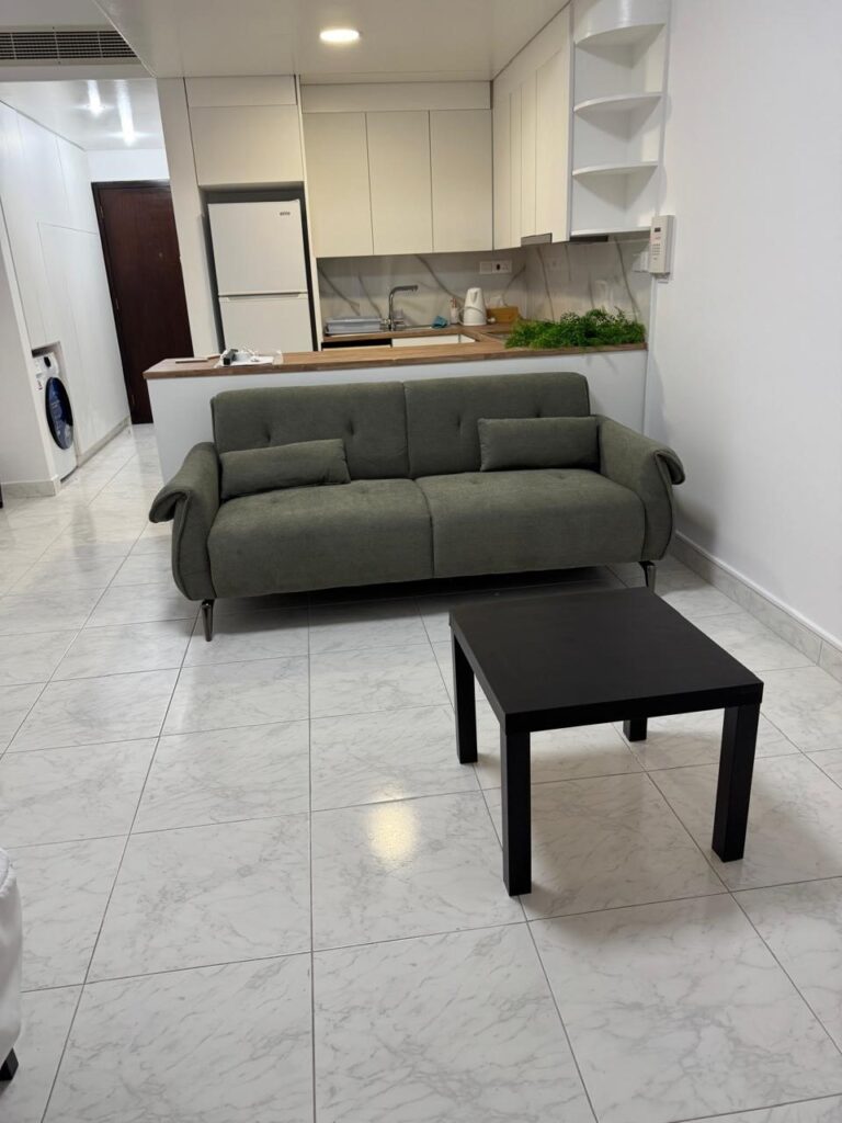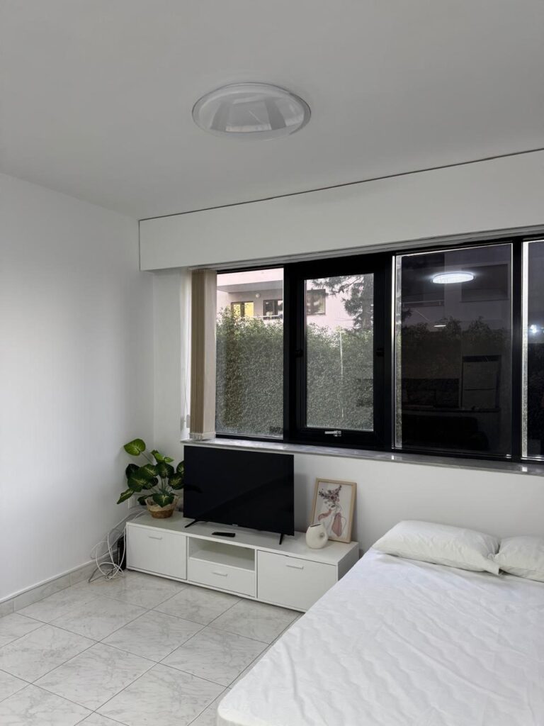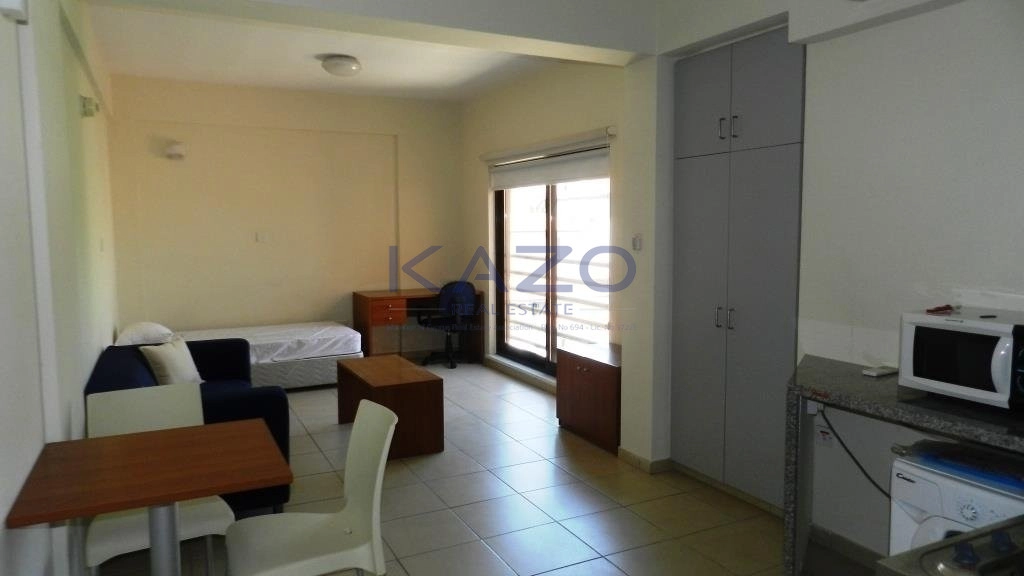 Step inside to find a fully furnished interior with contemporary finishes. The living and sleeping area is arranged for maximum use of space and includes a comfortable bed, sofa, work desk, and storage solutions. The open kitchen is equipped with modern appliances and a dining area, perfect for meals at home. A clean and functional bathroom completes the studio, offering all the essentials in a practical layout.