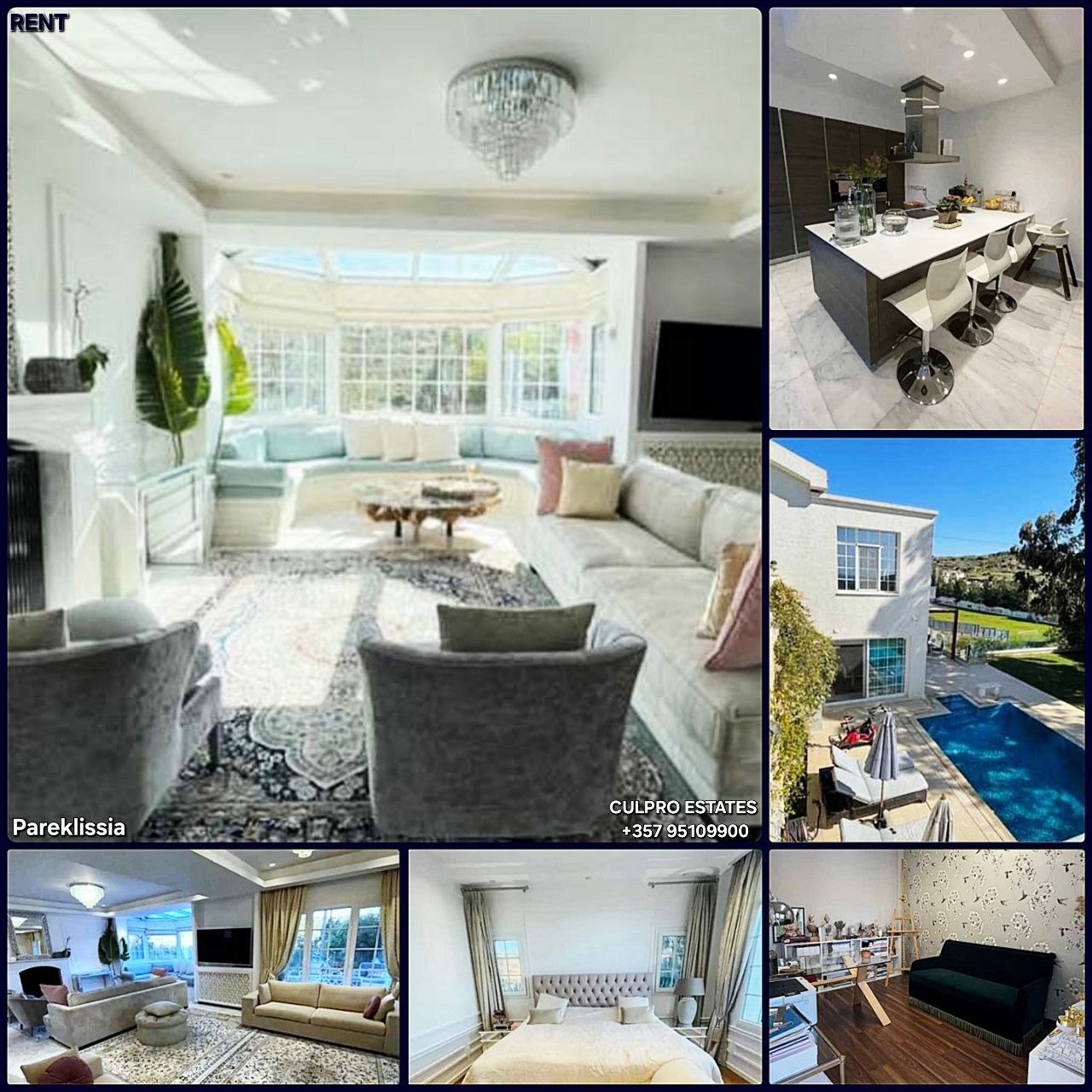 Rent. Elegant 4-bedroom house with a pool in Parekklisia beyond the highway, Limassol. All infrastructure and the beach are an 11-minute drive away. Living area: 250 sq m. Land area: 350 sq m. Kitchen (has a drinking water filter). Living room. 4 bedrooms. Study. Bathrooms: 4. Steam room. Balcony. Veranda. Smart home system. High ceilings. VRV air conditioning. Diesel heating. Dryer + washing machine. Marble floors. Italian furniture. Guest room. Gym. Barbecue area. Garden. Pool. 2 parking spaces. Alarm. Year of construction: 2017. Energy efficiency class A. Pets prohibited. Price: 8,500 + 2 deposits + extra 300 EUR for pool and garden maintenance. Agency CULPRO Estates Ltd L.N 197/E R.N 1189 +357 95109900 +357 95592209 A181