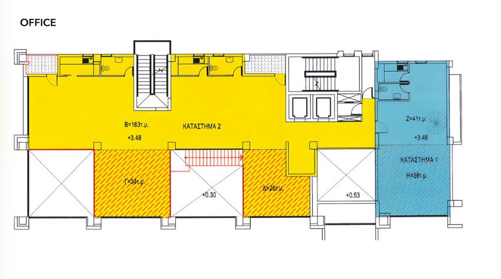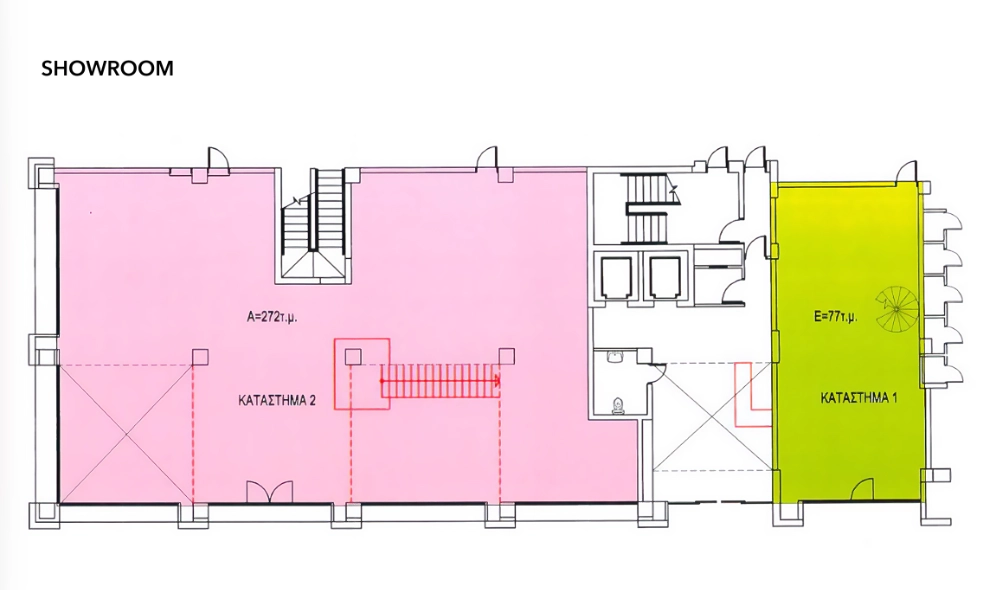 Commercial building for rent with a total area of 649 m2 in Neapolis, Limassol. The building includes a spacious showroom on the ground floor with an area of 272 m2 and a mezzanine of 223 m2, as well as a separate office block: 77 m2 on the ground floor and 77 m2 on the mezzanine, with a convenient layout and separate entrances.The property is offered unfurnished, with ready-made utilities, large stained glass windows, stairs between the levels, sanitary facilities and the possibility of flexible organization of the interior space for the needs of the tenant.The building is located on the first line with excellent visibility and convenient access, in a busy commercial area with high car and pedestrian traffic.
