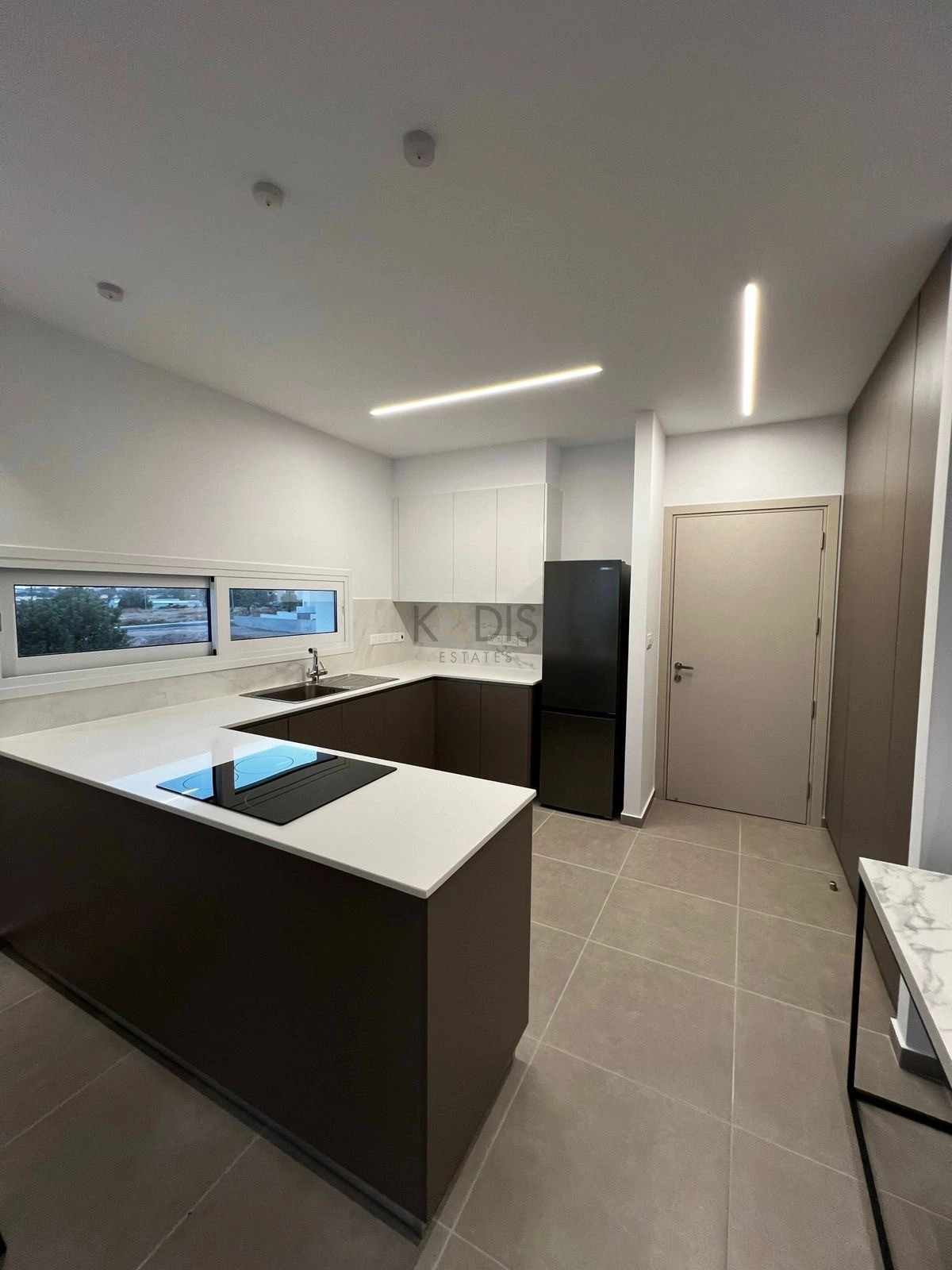 A modern kitchen fully equipped with an electric hob, built-in oven, fridge, and washing machine.