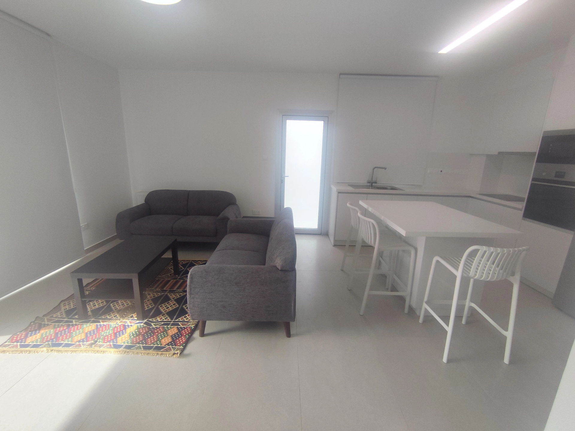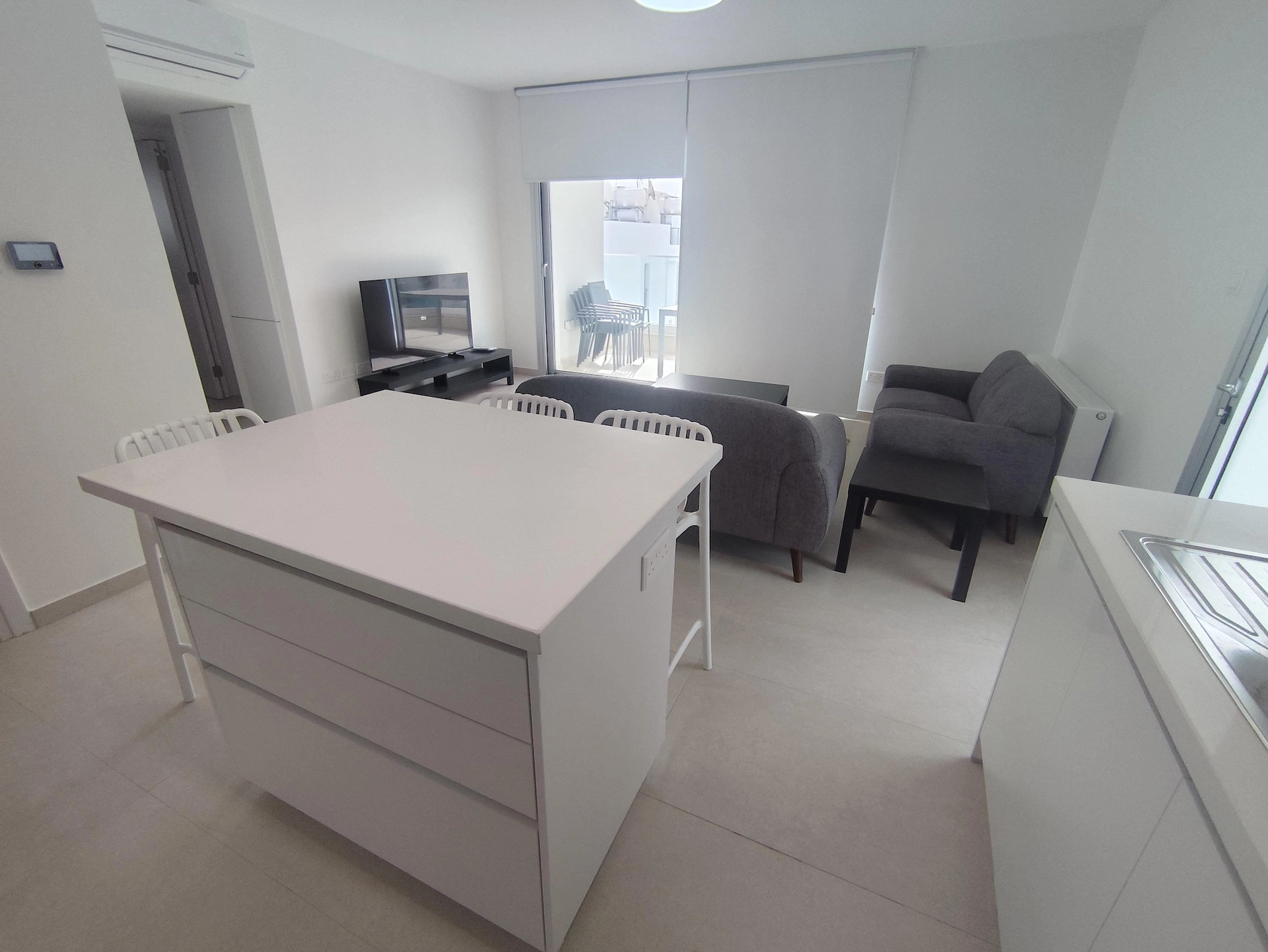 It has open plan kitchen (with kitchen island), one living area , two bedrooms , family bathroom , one guest w.c. one covered parking space, one disable parking space and a storage room.