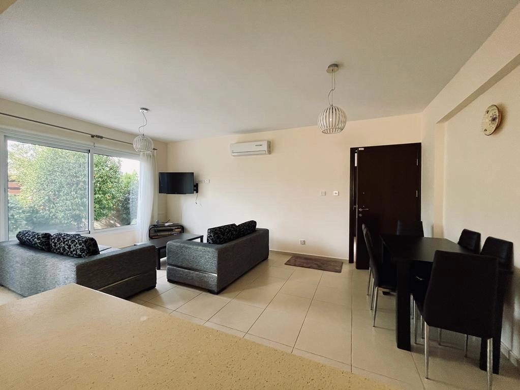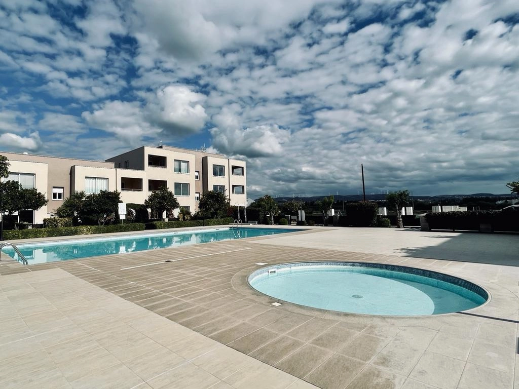 For rent a spacious 2-bedroom ground floor apartment with its own plot in a complex with a swimming pool and playground in Mandria Pafou, Paphos. The apartment includes two bathrooms (bath and shower), an internal area of 80 square meters, a covered veranda of 12 square meters, as well as a garden area around the perimeter. Layout: living room, open plan kitchen with access to the veranda, shared bathroom, two bedrooms and the master bedroom with its own bathroom (shower). The complex is located a 5-minute drive from Paphos Airport, a few minutes walk from the center of Mandria village, a maximum of 1.5 km from the coast. Convenient access to the expressway, 10-12 minutes by car to the center of Paphos.