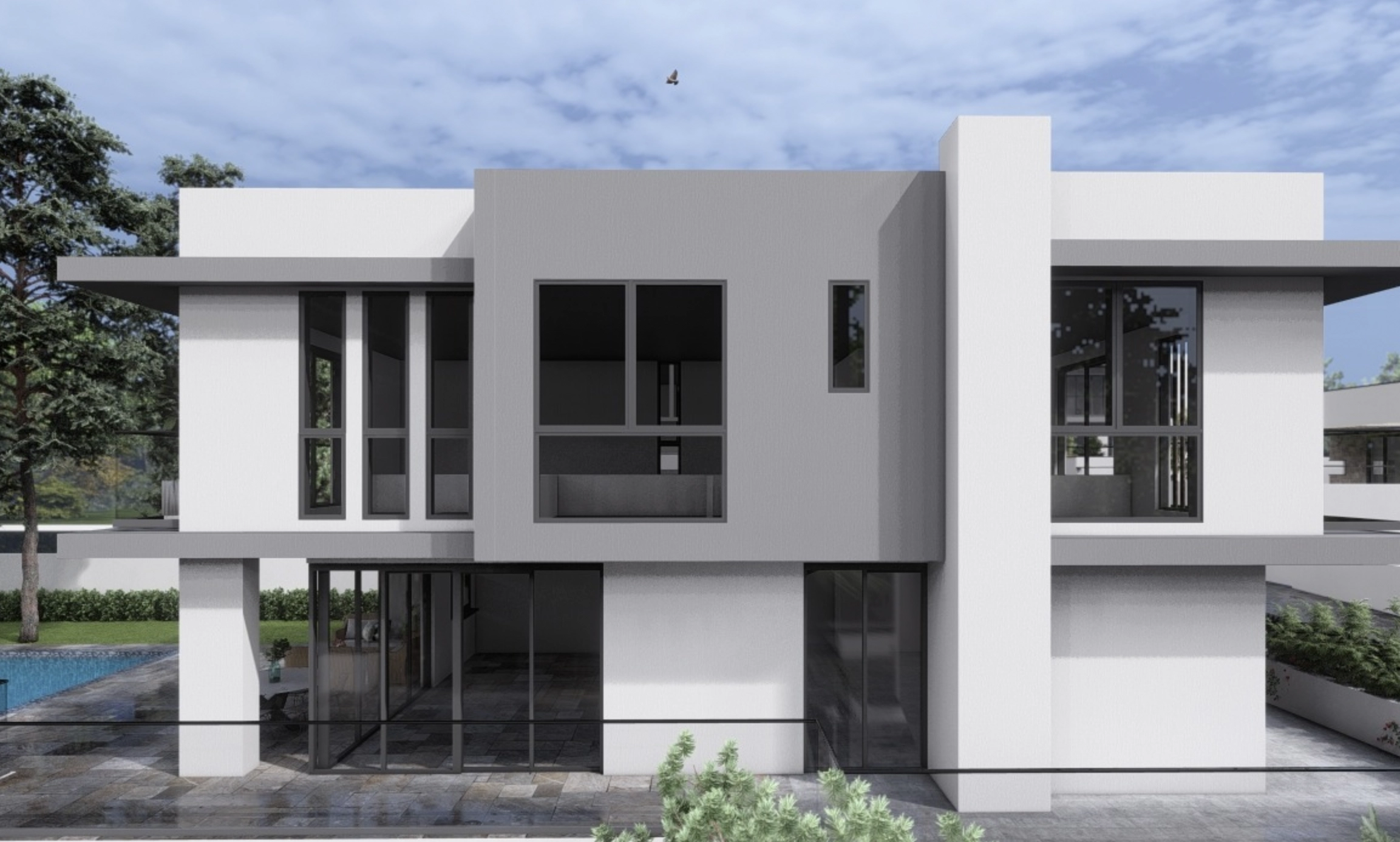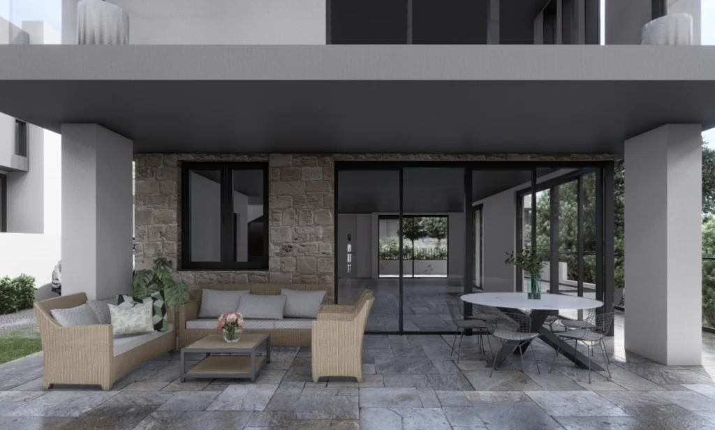 The architecture combines clean modern lines with natural materials, creating a warm and harmonious living environment. Large windows offer beautiful views of the surrounding green landscape, while the overall concept of the complex ensures privacy, tranquility, and a high standard of living.