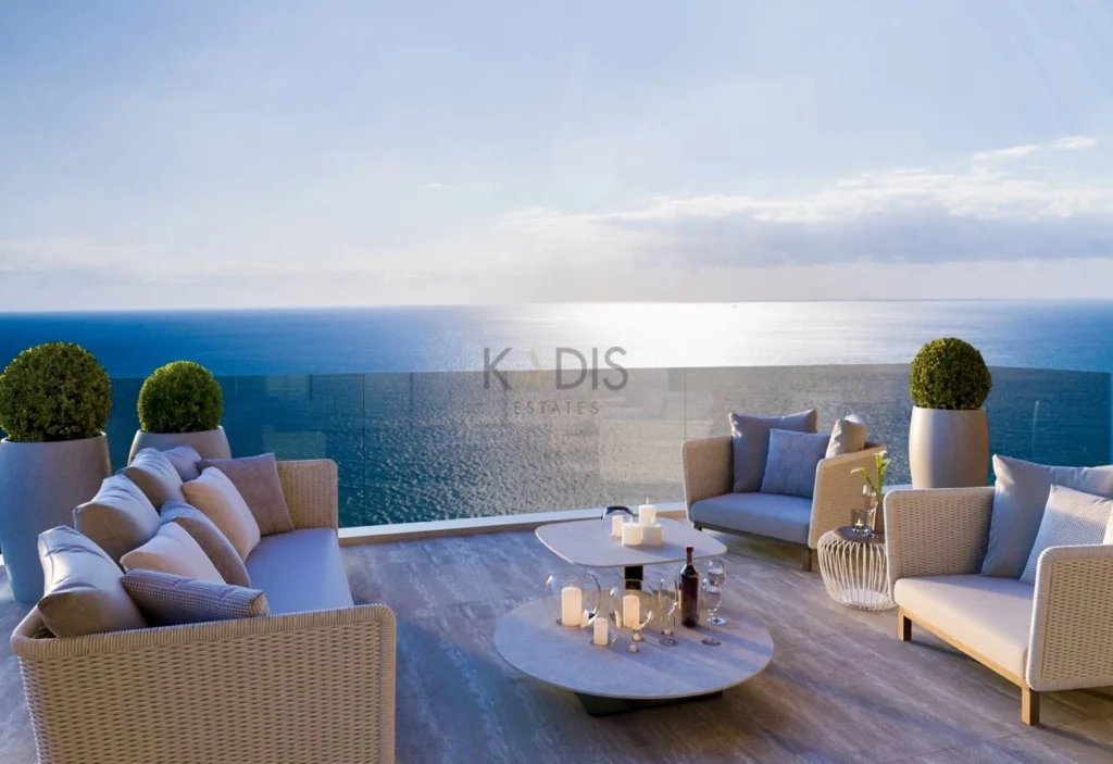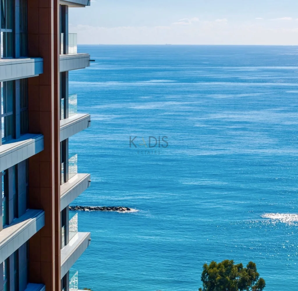 A spacious 2-bedroom apartment right across from the sea in Agios Tychonas, offering panoramic views, 5-star building amenities, and just a short walk to the beach and local shops.