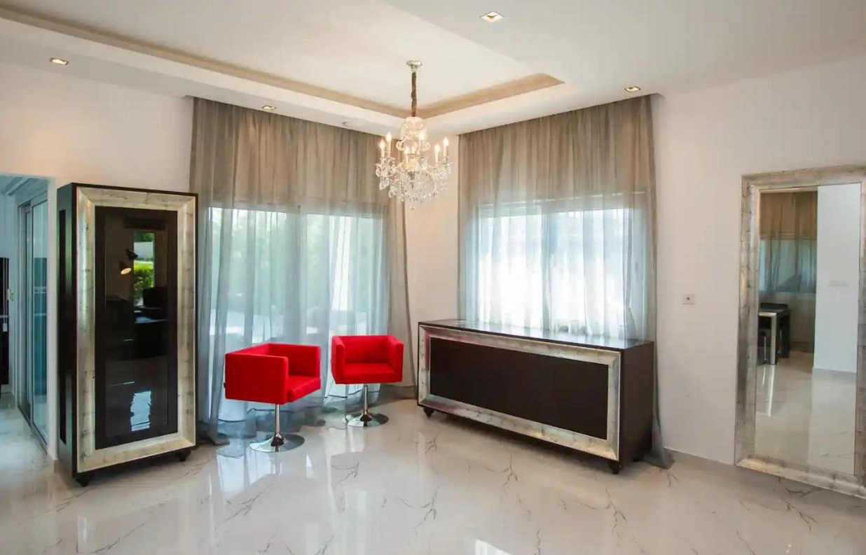 For rent: a modern 4+1 bedroom villa located in the prestigious Agios Tychonas area of Limassol, just 1000 meters from the sea and close to all necessary amenities and infrastructure. The property features a beautifully landscaped garden, a private heated swimming pool, an outdoor shower, and a covered BBQ area. The ground floor offers a spacious open-plan living and dining area, a semi-open but separate kitchen, and a guest WC. The first floor comprises three bedrooms, including a master bedroom with en-suite bathroom, a main family bathroom, and a terrace accessible from both the master and one of the guest bedrooms. The basement level can be used as staff quarters or a guest studio, complete with a bedroom, living area, and shower room. The villa is fully furnished and equipped, featuring a rooftop garden/terrace, a covered garage, and a storage room. The property includes three bathrooms and one guest WC, a staff/guest studio, laundry room, covered garage for two cars and a motorcycle, VRV air-conditioning, split units, underfloor heating on all levels, air-to-water heat pump, diesel heater, Siemens smart controls, a 10kW 3-phase photovoltaic hybrid system, alarm system, CCTV, SMART home electrical setup, electric shading, and jacuzzi/hydro-massage bathtubs. Title deed available.