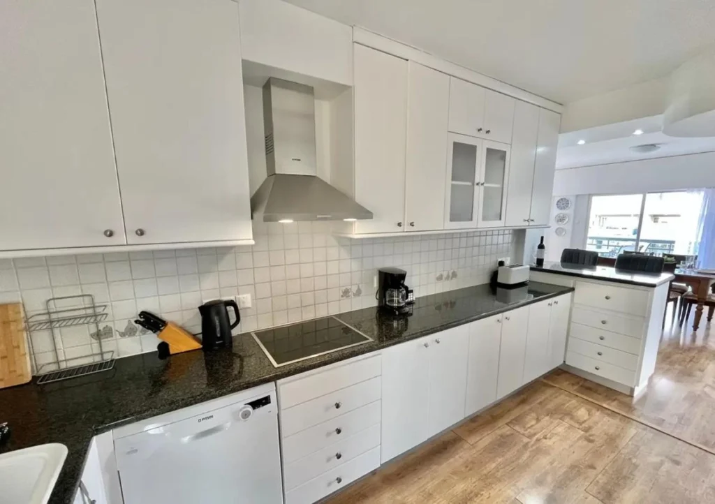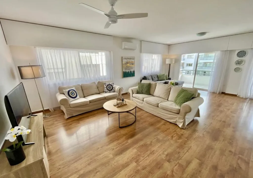 Three-bedroom apartment for rent in Neapolis, Limassol, with a total area of 180 m2 on the 3rd floor. The apartment is fully furnished and equipped with air conditioning in all rooms, includes three bedrooms, two bathrooms, a balcony and a storage room. The master bedroom is equipped with a private bathroom with a shower and plenty of closets. The second bedroom has two single beds, wardrobes, air conditioning and a ceiling fan, the third bedroom includes a pull-out sofa and wardrobes. The spacious living room combines a seating area with a TV and sofas, a dining area for six people and an additional seating area with armchairs, with access to a spacious private veranda overlooking the sea. The kitchen is fully equipped with modern appliances and necessary utensils, next to the laundry room with washing machine and dryer, iron and ironing board. The building has an elevator, covered parking and storage space. The apartment is located just 350 meters from the beach, near supermarkets, cafes, restaurants and public transport stops.