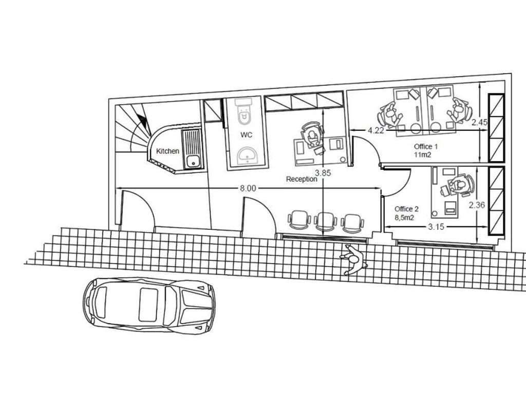 Commercial premises with an area of 62 m2 for rent in the area of the Histotic Center, Limassol. The facility is located on the Ground floor and includes 2 offices, a pantry-kitchen, a reception, and a toilet.The room is equipped with split-system air conditioners, a prepared electrical installation, ready-made infrastructure for connecting the Internet and telephone network, the possibility of placing signage is provided; the interior layout is functional and easily adapts to various types of activities, the facade is wide and suitable for branding, the interior is bright with natural lighting.The property is located in the central part of the city next to the Citizen Service Center, Electricity Authority of Cyprus and Limassol Municipality, surrounded by professional and administrative services; in the immediate vicinity there are public parking lots, cafes, restaurants and daily infrastructure facilities.The facility is suitable for hosting an accounting or legal office, a creative agency, an educational center, a medical practice, a showroom, a retail store, a startup, and other professional activities.