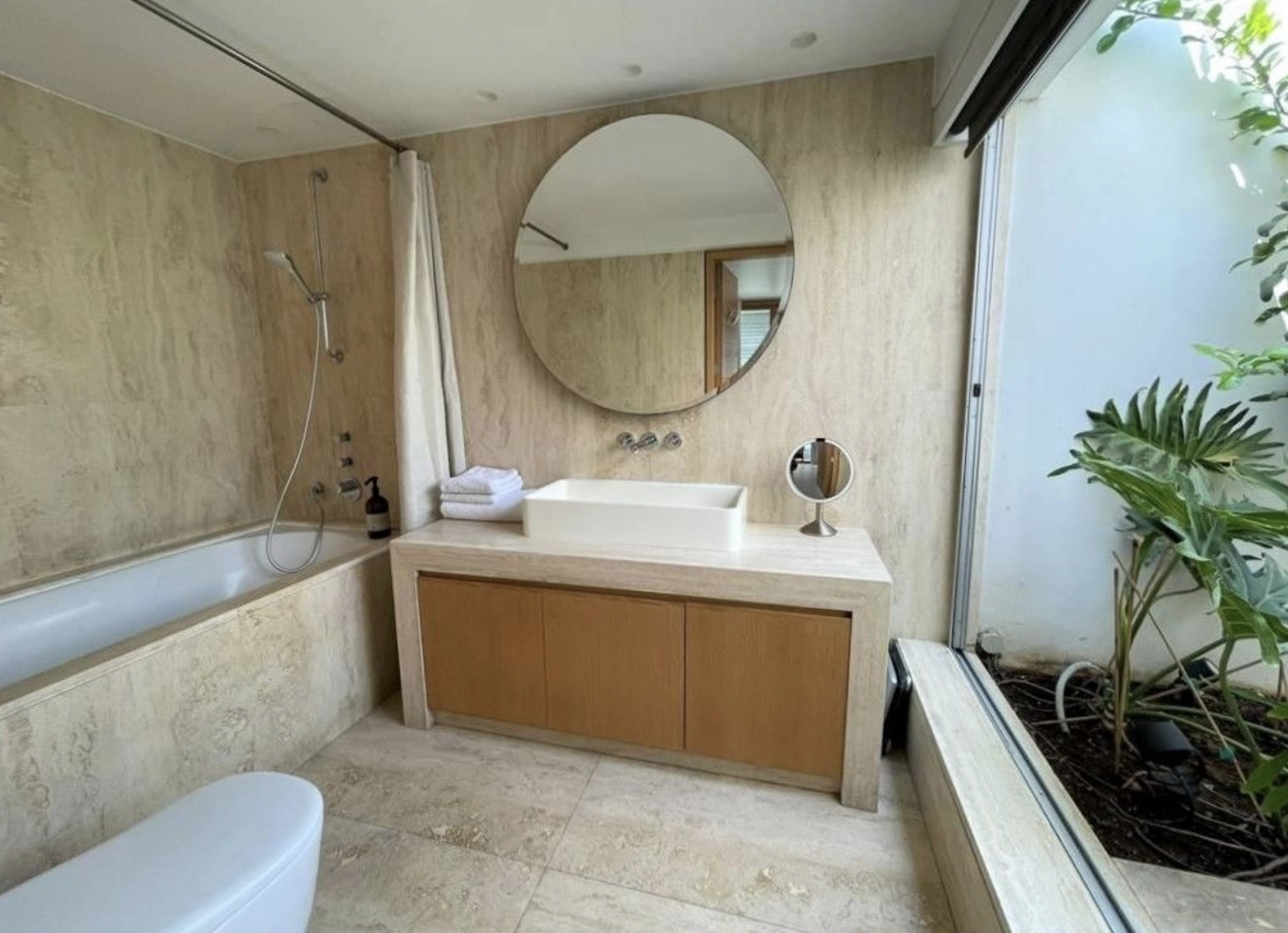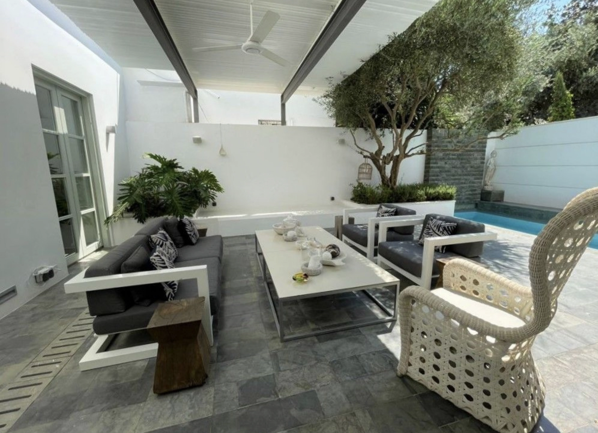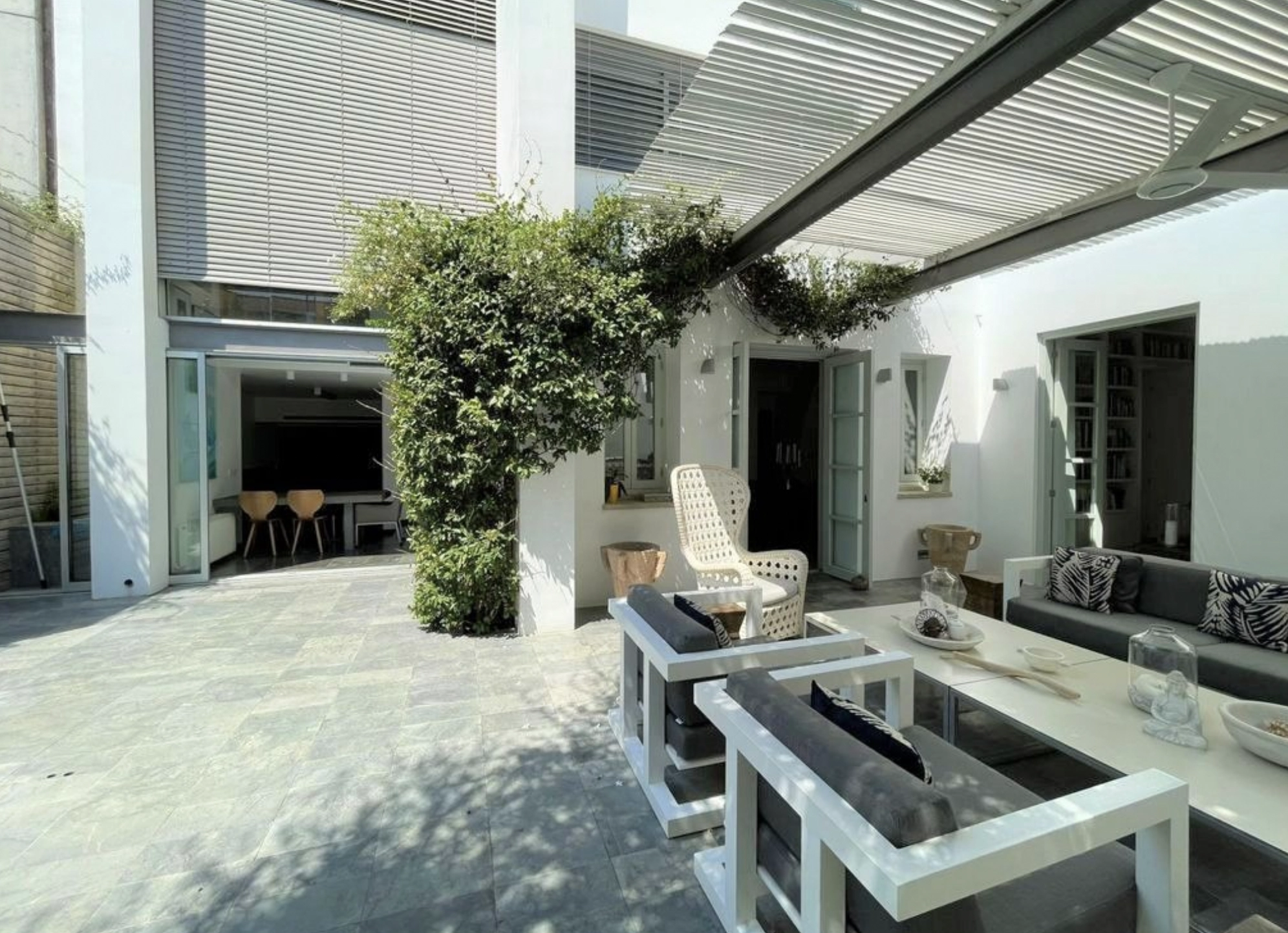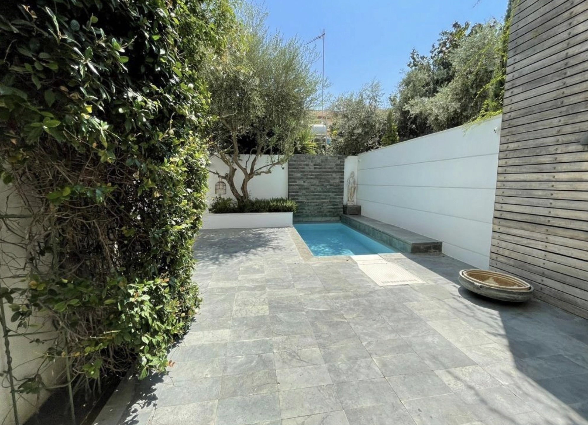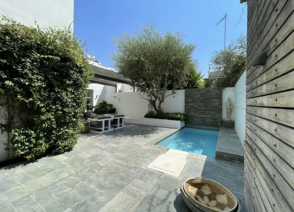 Outdoors, a secluded private courtyard invites relaxation, featuring a shaded pergola and a refreshing plunge pool — an intimate oasis in the city center. Practicality meets luxury with a separate nanny’s room, laundry room, ample storage spaces, and private parking.