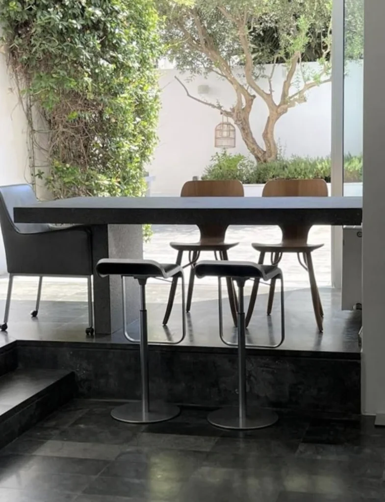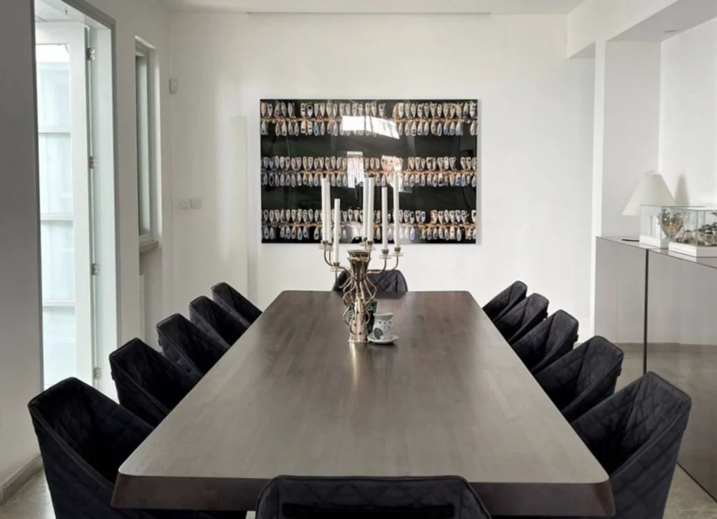The home’s grand living room, centered around a stylish fireplace, creates a warm yet sophisticated ambiance, seamlessly flowing into an expansive dining area designed to host up to 16 guests — perfect for elegant entertaining. At the heart of the residence lies a bespoke Minotti stone kitchen, combining premium craftsmanship with striking modern aesthetics. A dedicated office provides a quiet workspace, while an additional guest/playroom offers flexibility for family living.