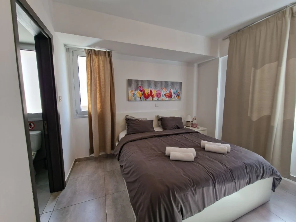 A double apartment for rent in the area of the city center of Larnaca, near the Church of St. Lazarus, on the 1st floor with two bathrooms (one of which is en suite) and a private parking space. The apartment is fully furnished. The living area is 90 m2, the total area is 115 m2. The house was built in 2016, has fast Internet from Cyta and satellite TV.