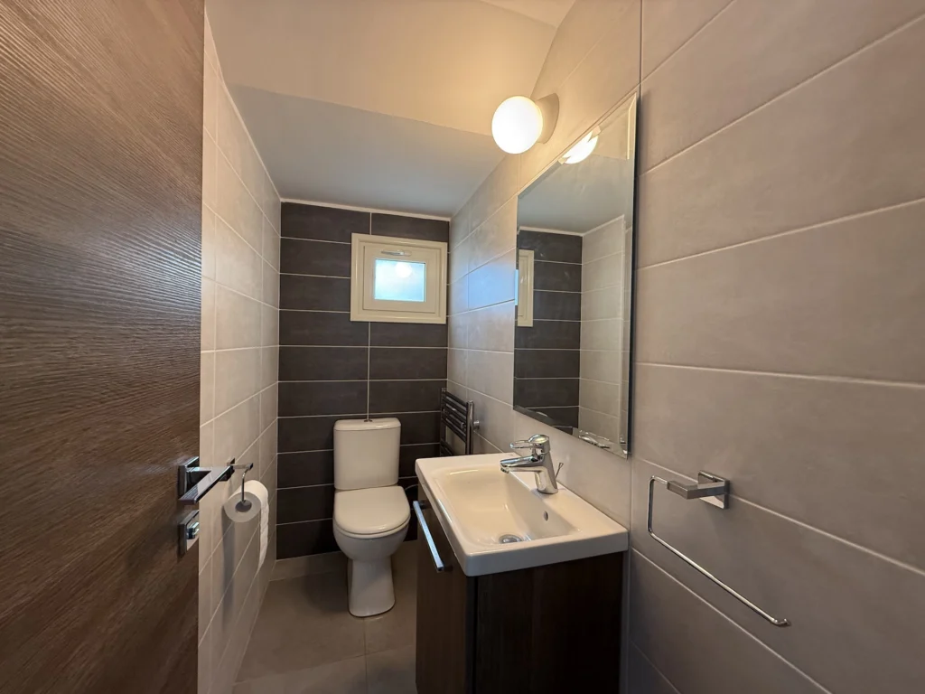 Situated in a quiet residential neighborhood, the property is maintained in excellent condition and provides a comfortable and spacious sitting, lounge, and dining area. The separate, fully equipped kitchen offers direct access to the rear garden, where a covered pergola creates an ideal space for outdoor relaxation and entertaining.