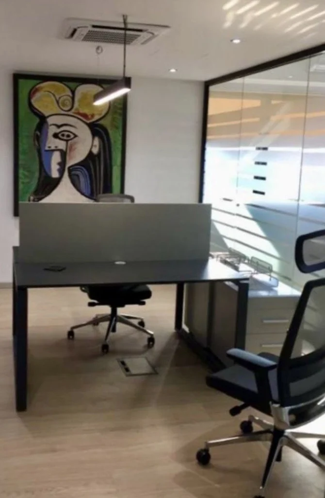 The office is thoughtfully designed with modern glass partitions, creating a bright and professional working environment while maintaining functional separation between departments. A stylish marble reception desk is already installed, offering an impressive first impression for clients and visitors.