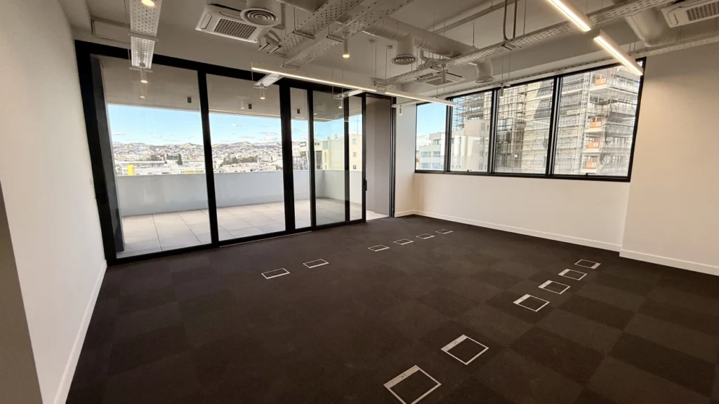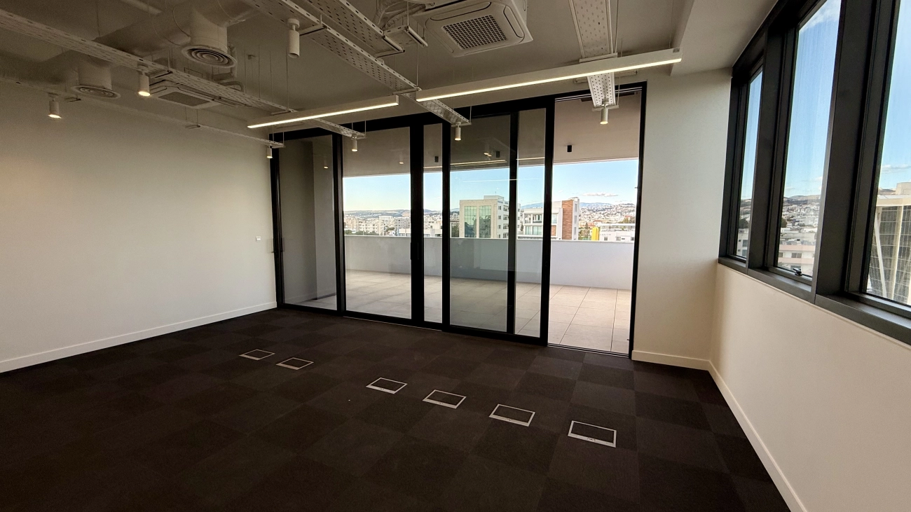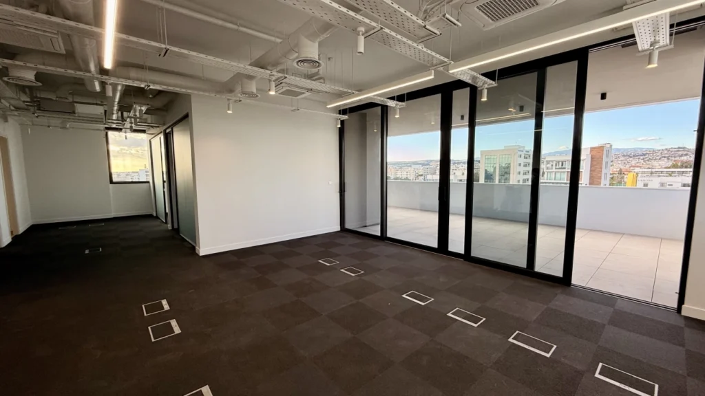 A 285 sq. m office space is available for rent in the Mesa Geitonia area of ​​Limassol. The space comprises 139 sq. m of interior space (two separate offices, two bathrooms, a kitchen, and a server room) and a 146 sq. m covered terrace with a separate office, kitchen, and two bathrooms. The building is located in one of the city’s most attractive residential areas with easy access to Limassol’s business center, cafes, restaurants, boutiques, and shopping centers. Ceilings are 3.2 m high, provisions are made for the installation of a VRV central air conditioning system, European-brand plumbing fixtures, and double-glazed thermal aluminum window frames. The building has five floors of offices and 35 parking spaces. Each floor includes two to three separate offices, ideal for small and medium-sized businesses. Owners also have access to a spacious veranda. The building is located just steps from prestigious business centers, banks, and high-class restaurants. Watch the video review!