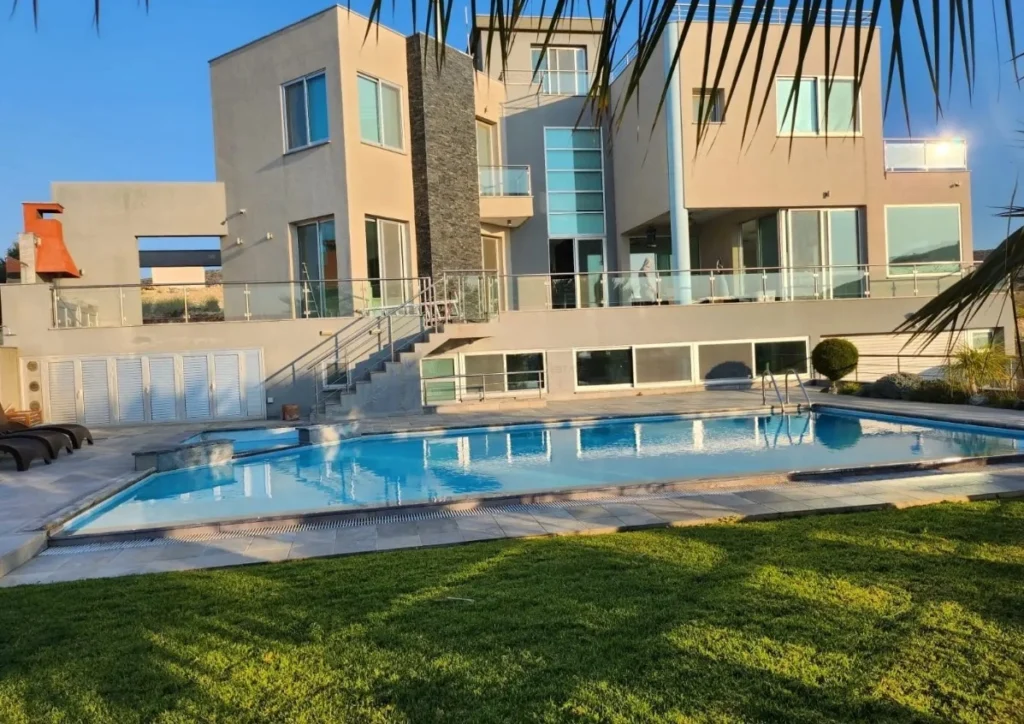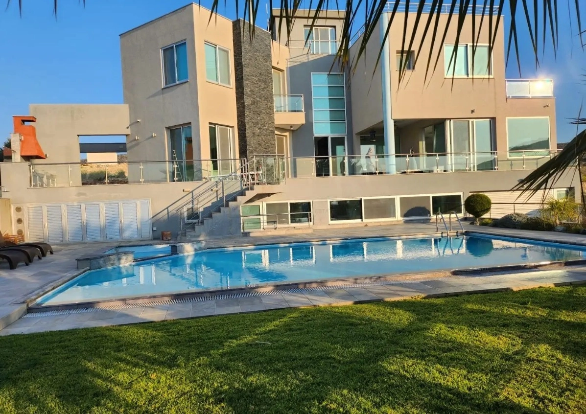 Five-bedroom villa for rent in the area of Agios Athanasios, Limassol, with an area of 420 m2, plot of 713 m2. The villa is located on three levels and includes three bedrooms with private bathrooms, a master bedroom with a dressing room and a Jacuzzi, an additional room for a bedroom or office, separate staff apartments, four bathrooms and a guest bathroom. There is a spacious living and dining room, a modern kitchen with a fireplace, a pantry, a laundry room, and a game room with a bar and billiards. There is a private overflow pool with a Jacuzzi and salt water system, a BBQ area, a garden with fruit trees and a roof garden. There are two indoor and two outdoor parking lots, electric gates are installed. The villa is equipped with a video surveillance system, alarm system, air conditioning, underfloor heating, photovoltaic system and solar water heating. Built in 2012, for rent unfurnished. The villa has a panoramic view of the mountains and the sea.