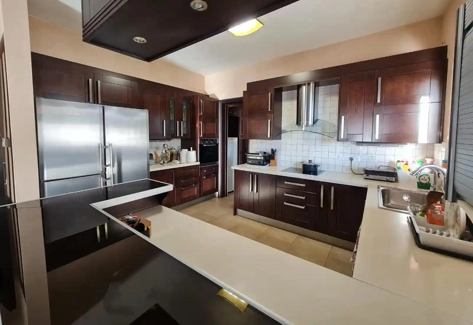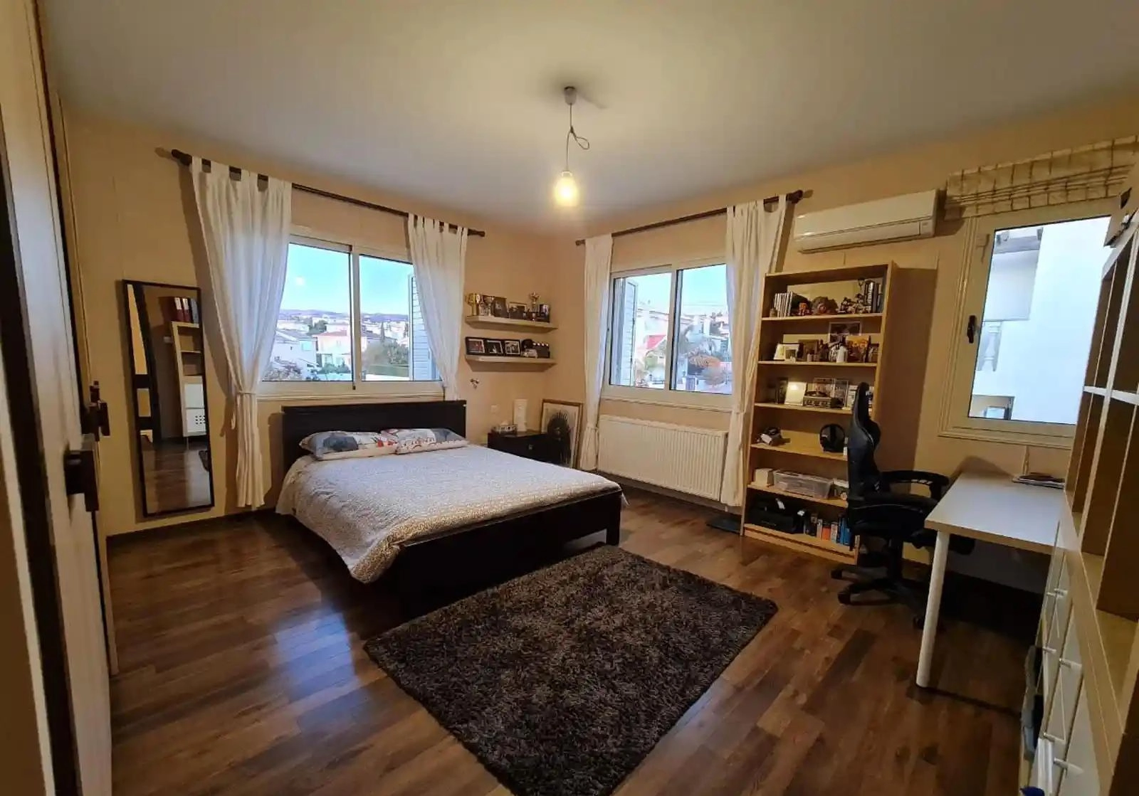 Spacious luxury villa for rent in the area of Konia, Paphos. On the ground floor there is a living room, a dining room, an office, a separate spacious kitchen, a sitting area with a fireplace and a breakfast bar, a laundry room, a guest bathroom and a large veranda by the pool; on the second floor there are 4 bedrooms with parquet floors, two of which have access to a shared large balcony and an office with a kitchenette on the landing. The master bedroom has a bathroom and a walk-in closet. The villa is fully furnished and equipped with household appliances. Air conditioning, solar panels, double glazing and blinds on the windows, Wi-Fi, cable TV, irrigation system are installed. There is a mature garden with fruit trees and gazebos, a barbecue area and a garage.