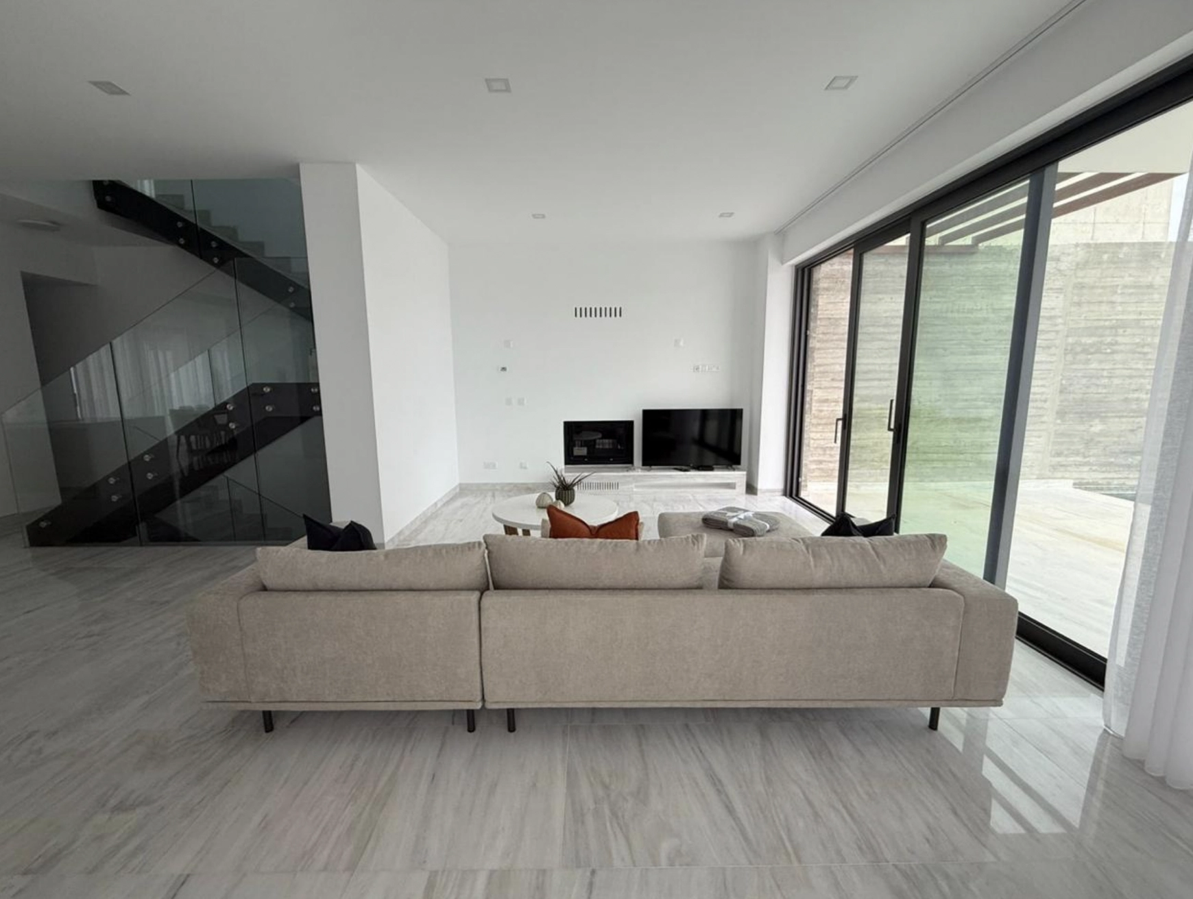 The villa is fully furnished and features spacious, light-filled interiors with top-quality finishes throughout, including marble floors and a stylish wood fireplace. The open-plan living and dining areas create a welcoming atmosphere, while the VRV climate control system ensures year-round comfort. An additional playroom provides flexible space for a family area, office, or entertainment room, and a separate storage room adds practicality.