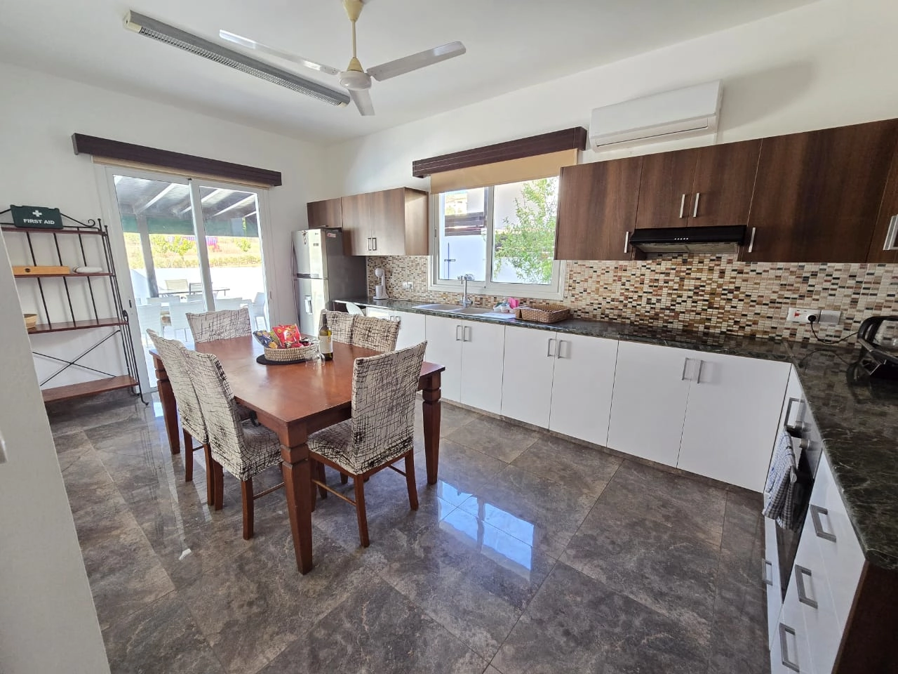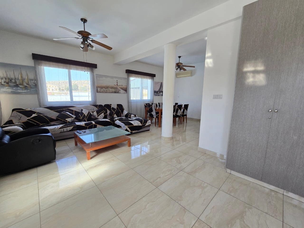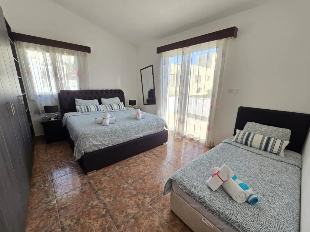 Villa for rent with private pool and sea views in Geroskipou area, Paphos. 3 large bedrooms, 3 bathrooms, balconies, air conditioning throughout the house and photovoltaic system, the house has high ceilings. On-site swimming pool, private parking and outdoor barbecue area. The house is located next to the park, in a dead end, in a beautiful location and in a quiet area. Pets allowed.