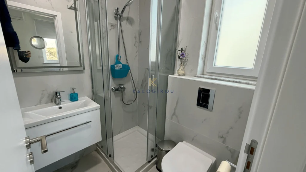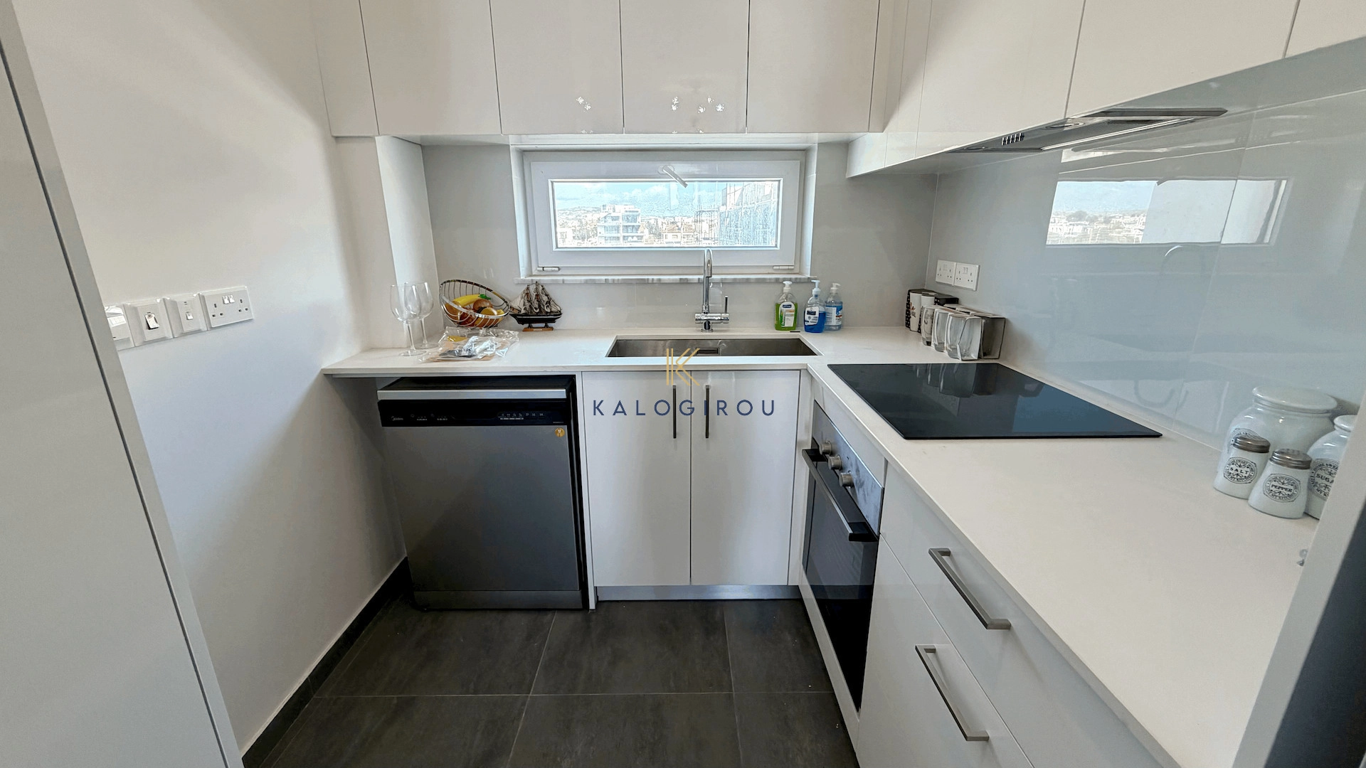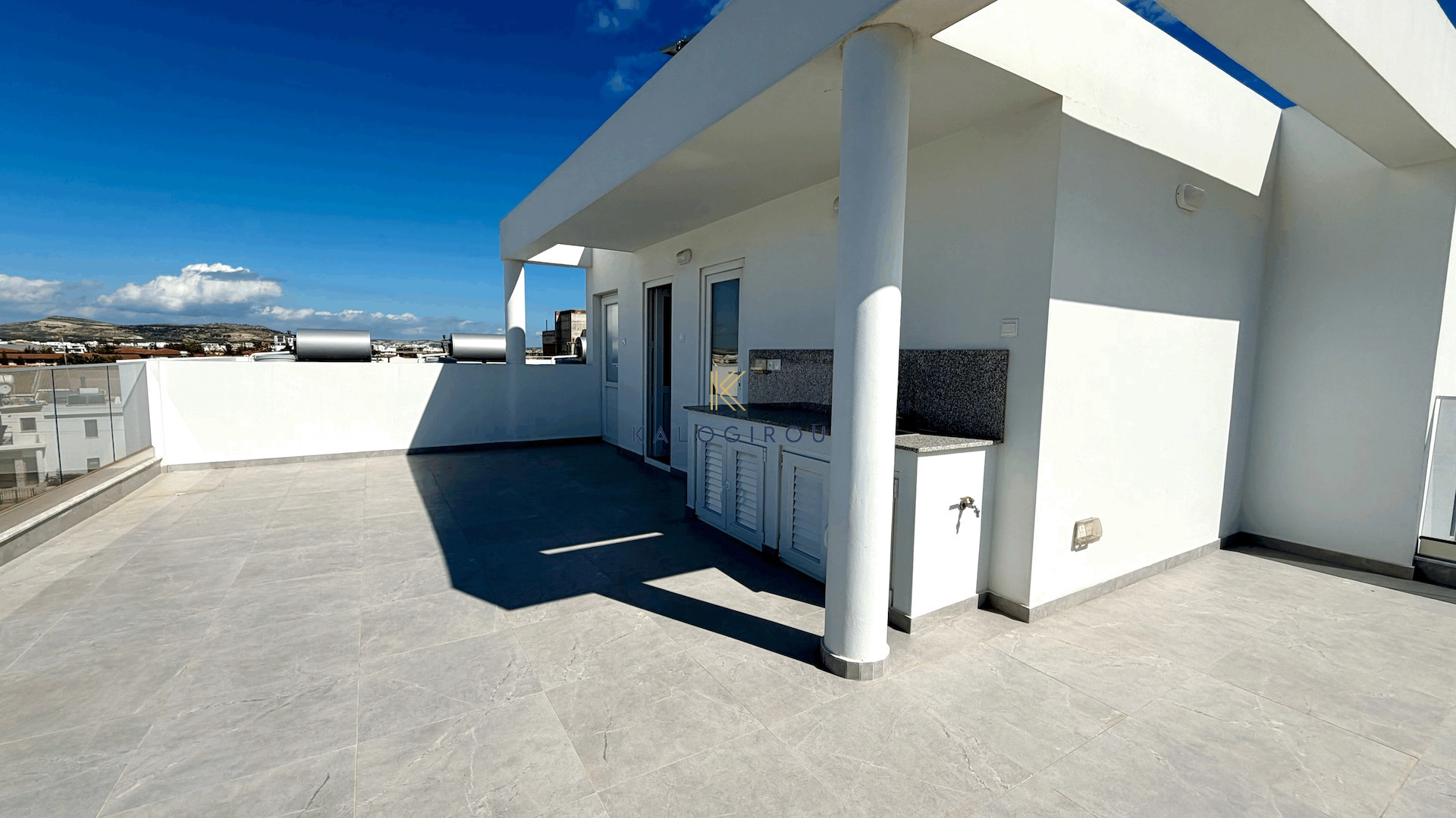 Penthouse with Roof Garden for Rent in Livadia area. The property consists of an open plan kitchen and living room with dining area, two bedrooms both with en suite shower and W/C and a guest toilet. It also offers direct access to its private roof garden with BBQ area that also has an additional toilet and a storage room.
