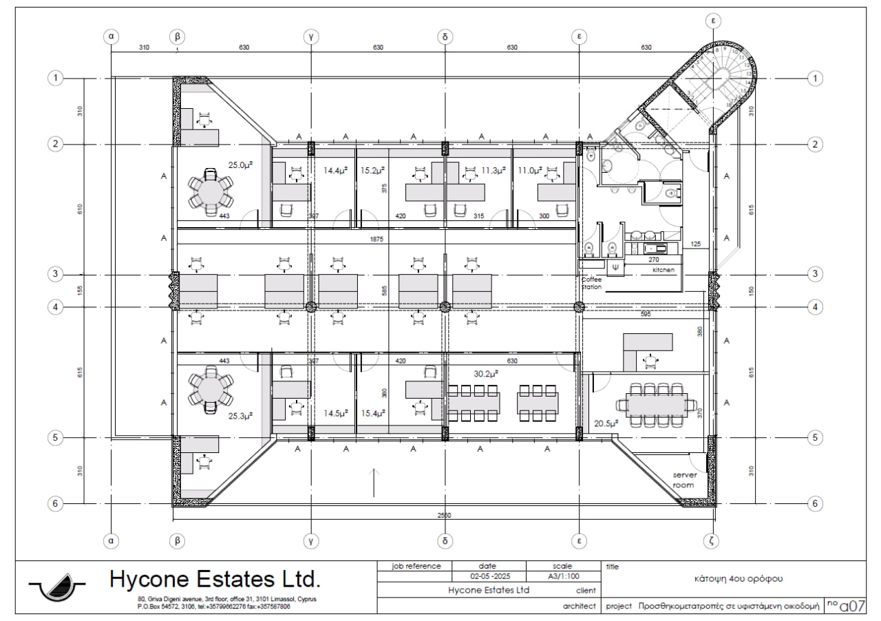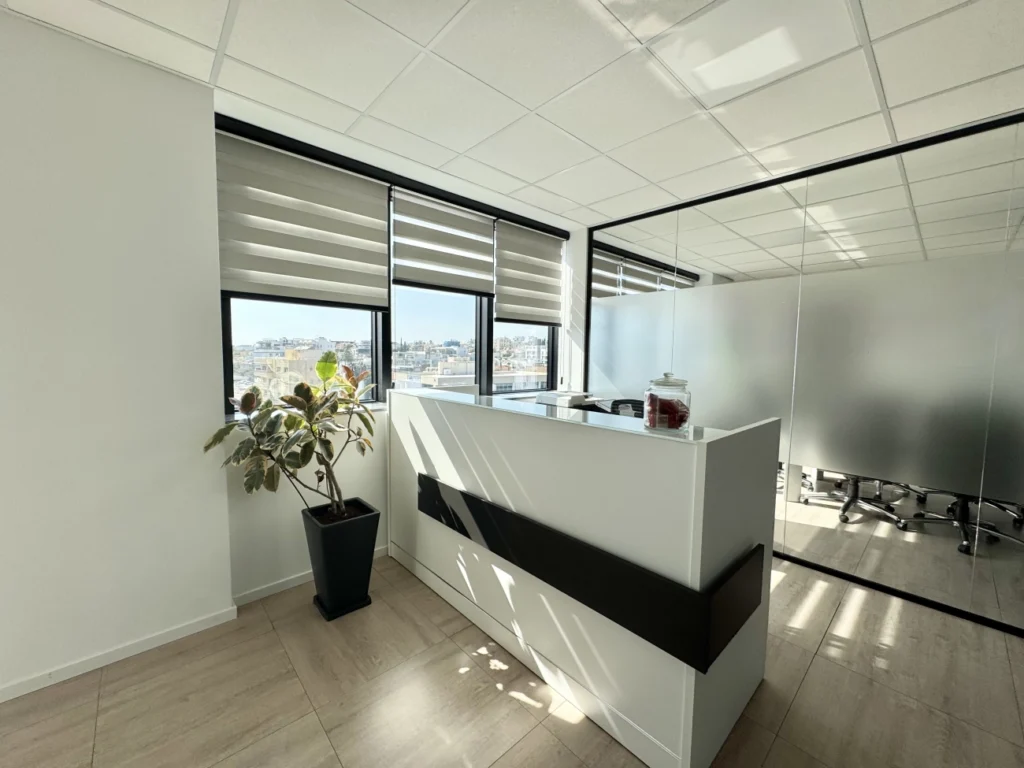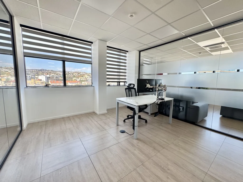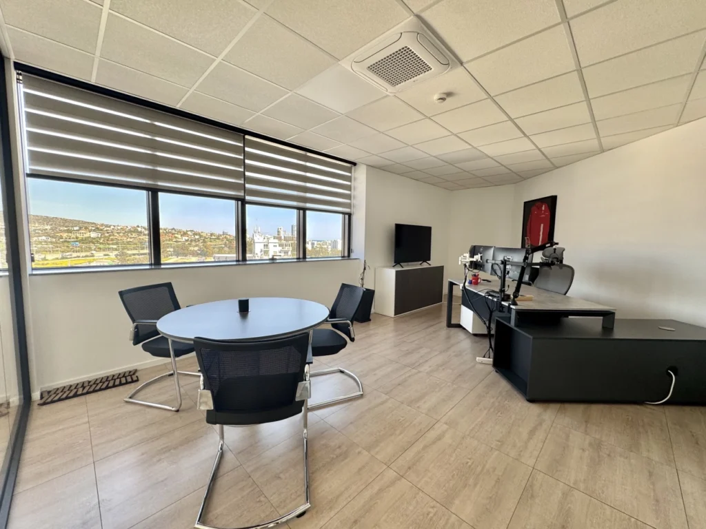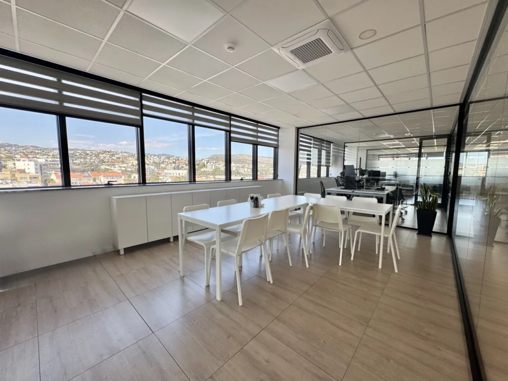 Office for rent with an area of 380 m2 in the Potamos Germasogeia area, Limassol. The office includes 10 separate offices, a spacious open plan area, 1 conference room, a kitchen with a dining area, a reception area, 6 toilets for men and women separately, as well as a pantry. The office is unfurnished, equipped with a VRV air conditioning system, a security system and a raised flooring system. The partitions inside the room can be changed if necessary, the space is designed for about 40 employees. The office is located on the 4th floor and occupies an entire floor of the building. The room includes a spacious rooftop terrace. The tenant has 11 parking spaces in the above-ground parking and 4 covered parking spaces in the underground parking. The room is available for rent immediately, furniture can be purchased separately by agreement. The minimum rental period is 2 years.