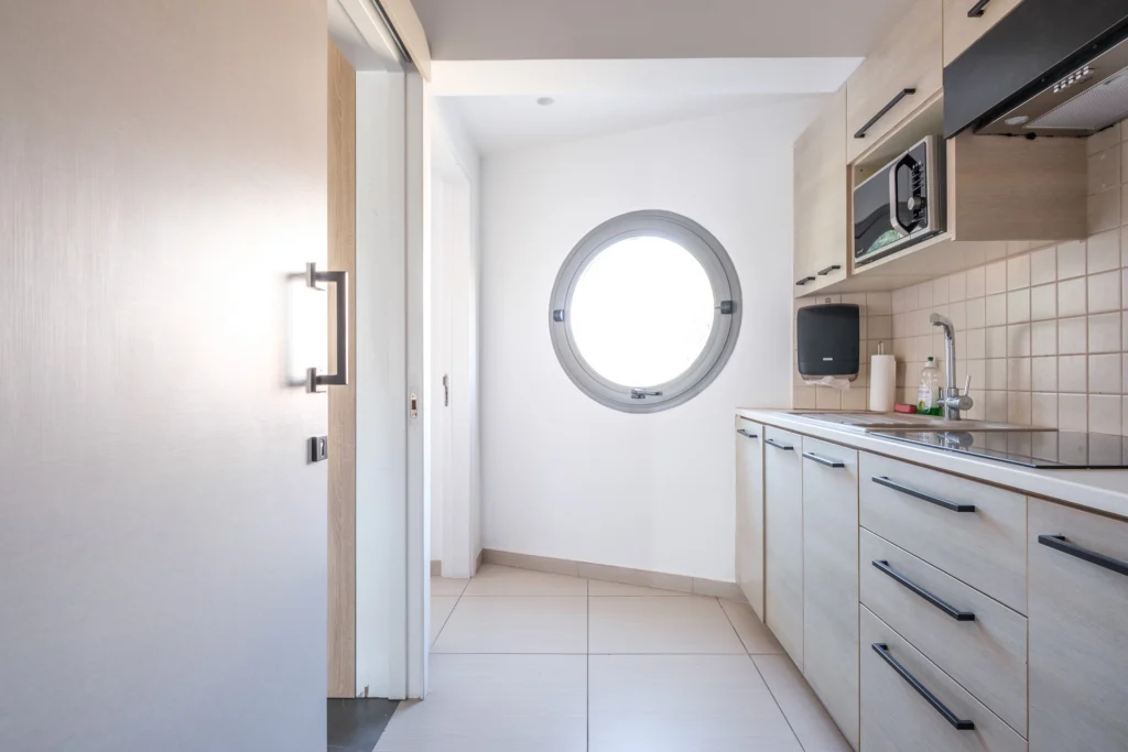 Yes, there is a fully equipped kitchen for staff convenience.