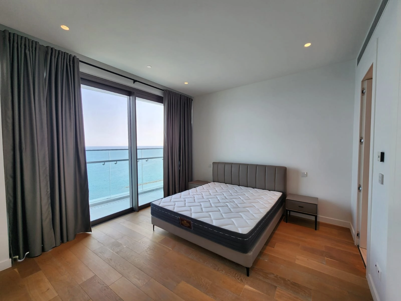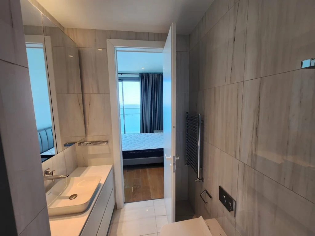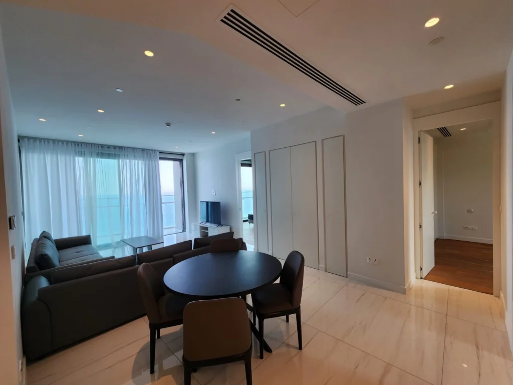 Floor-to-ceiling windows allow natural light to flood the apartment while providing direct access to a private balcony with breathtaking panoramic views of the Mediterranean Sea. This seamless connection between indoor and outdoor spaces creates an ideal setting for relaxation and entertaining.