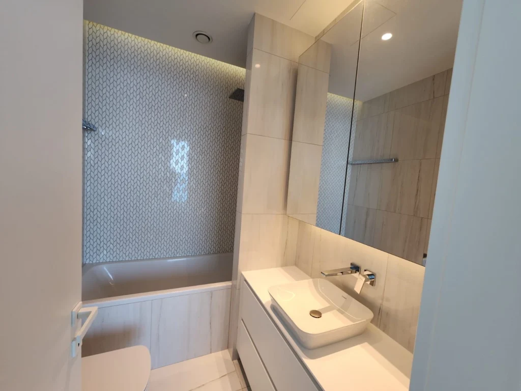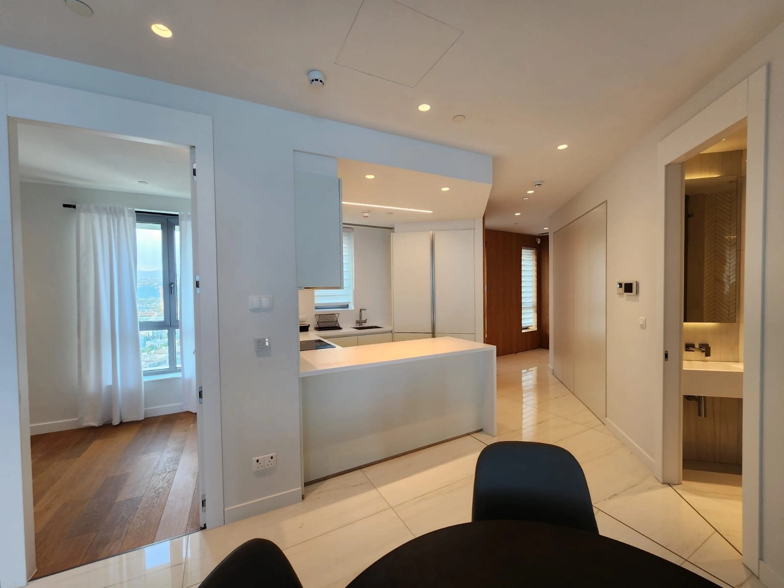 The modern kitchen is fully equipped with high-end appliances, while the bathrooms feature sleek, contemporary design and premium materials.