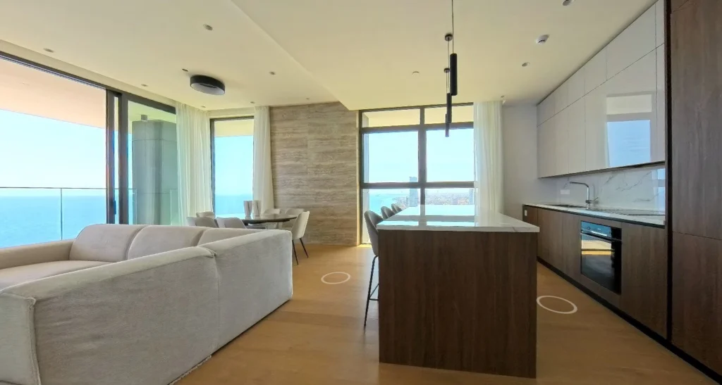 The apartment welcomes you with a spacious open-plan living and dining area, designed to embrace both light and openness. Floor-to-ceiling windows frame panoramic views of the sea and city, while sliding glass doors extend the interiors to a wide balcony. The layout allows for a relaxed family lounge and an elegant dining space, perfect for everyday comfort or entertaining.