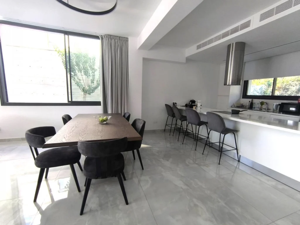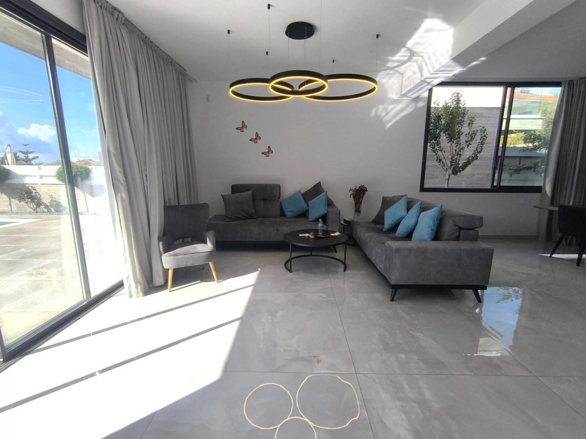 Four-bedroom villa for rent in the area of Chloraka, Paphos city. The villa is located in a quiet residential cul-de-sac among several modern houses, close to the coast, restaurants, bars and all necessary infrastructure. The house has a private entrance, covered parking, a private swimming pool, a landscaped garden and a sunny terrace for relaxing. The layout includes a spacious living room, an open-plan dining room and kitchen, a utility room, a guest bathroom and a work area. On the second floor there are four bedrooms, one of which has its own shower room, as well as a family bathroom. All bedrooms have access to balconies. An internal marble staircase leads to the upper level with a spacious roof terrace with sea and sunset views. The villa is equipped with underfloor heating, concealed VRF air conditioning, alarm system, suspended ceilings, modern aluminum window systems with thermal insulation, water pressure system and solar water heating system. The house has wall-mounted toilets, walk-in shower areas, tiled floors in all rooms and laminate floors in the bedrooms. It is possible to rent with furniture.