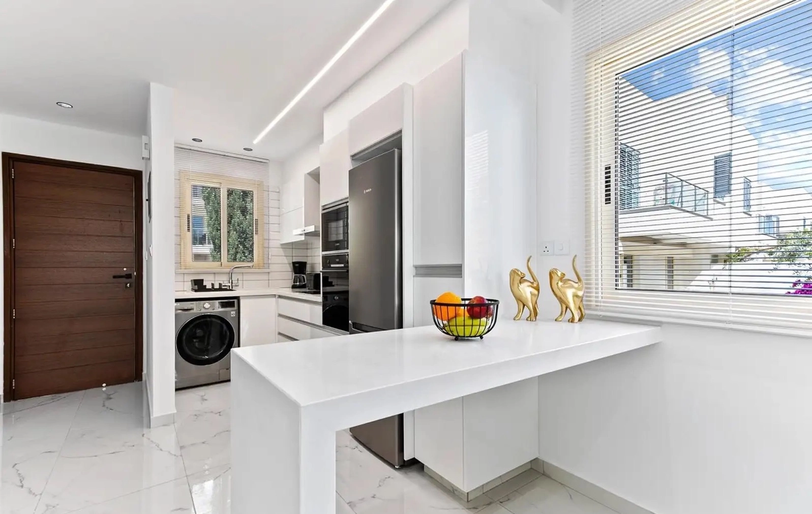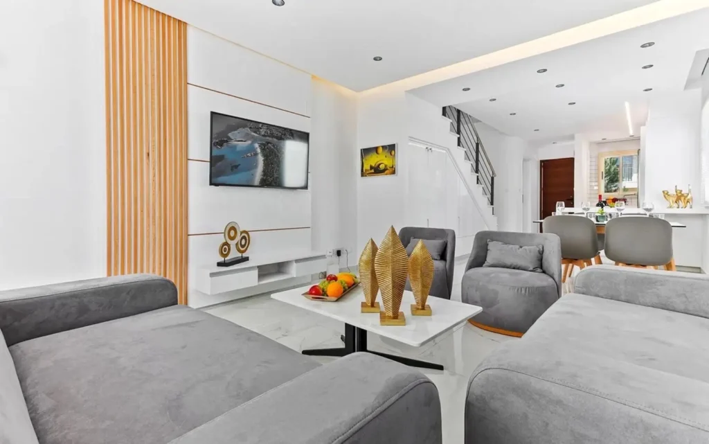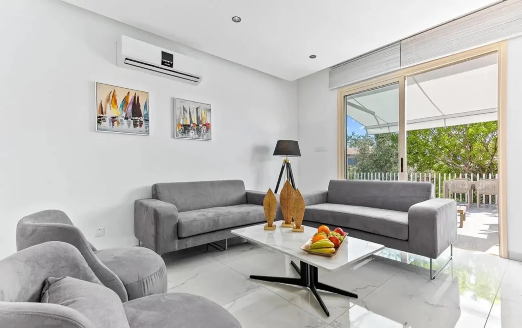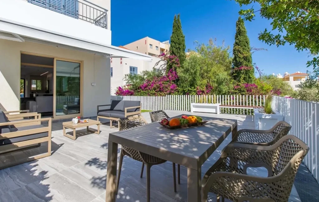 A luxurious corner townhouse with 2 bedrooms is available for rent, located in the complex in one of the most attractive areas of Paphos — Universal. The total area of the property is 182 m², of which 97 m² is the internal living area. The house features 2 bedrooms, 2 bathrooms, and a guest WC. The property has been recently fully renovated and is ready for immediate occupancy. It is fully equipped for comfortable living, including dishes, towels, bed linen, and other household essentials. The townhouse has a spacious veranda and a garden area, making it an excellent option for relaxation and outdoor living. The property is located in a quiet and peaceful area and includes private uncovered parking. The complex offers a heated indoor swimming pool, a wellness center, a gym, a pharmacy, a restaurant and lounge bar, a mini market, and a large lagoon-style communal swimming pool. The location is very convenient: only 5 minutes to the beach, 5 minutes to Kings Avenue Mall, and approximately 20 minutes to Paphos Airport.