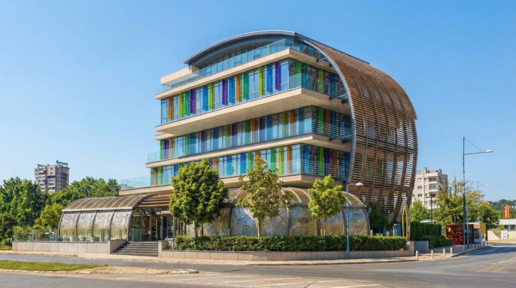 Large panoramic glazing provides excellent natural light, while the modern faсade enhances the company’s professional image.