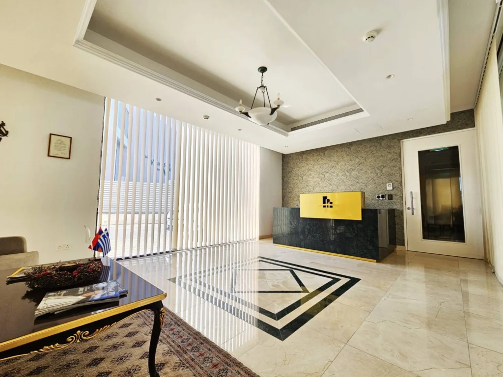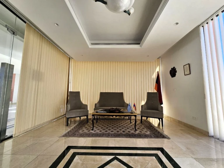Office space for rent in the area of Agios Athanasios, Limassol, with quick access to the highway. The room has a total area of 215 m2 and includes a kitchen, two bathrooms and balconies. The office is equipped with raised floors, full air conditioning, an administrator and 24-hour security are provided.