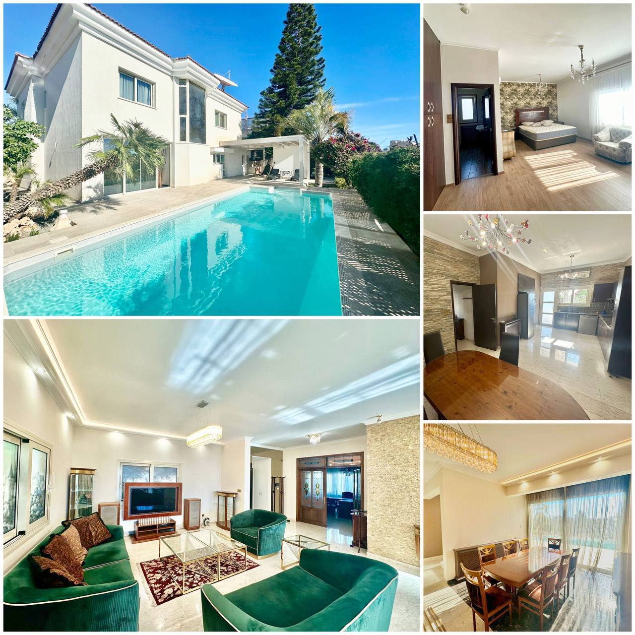 5105 RENT Limassol Villa 380m2 Location Potamos Germasogeia Sea within walking distance 2 levels 5 bedrooms + study 6 bathrooms (has a bathtub) 2 kitchens Air conditioning Heating (diesel) Pool, garden Barbecue area Alarm Covered parking Price 6000€ 2 deposits LN56/E,RN186