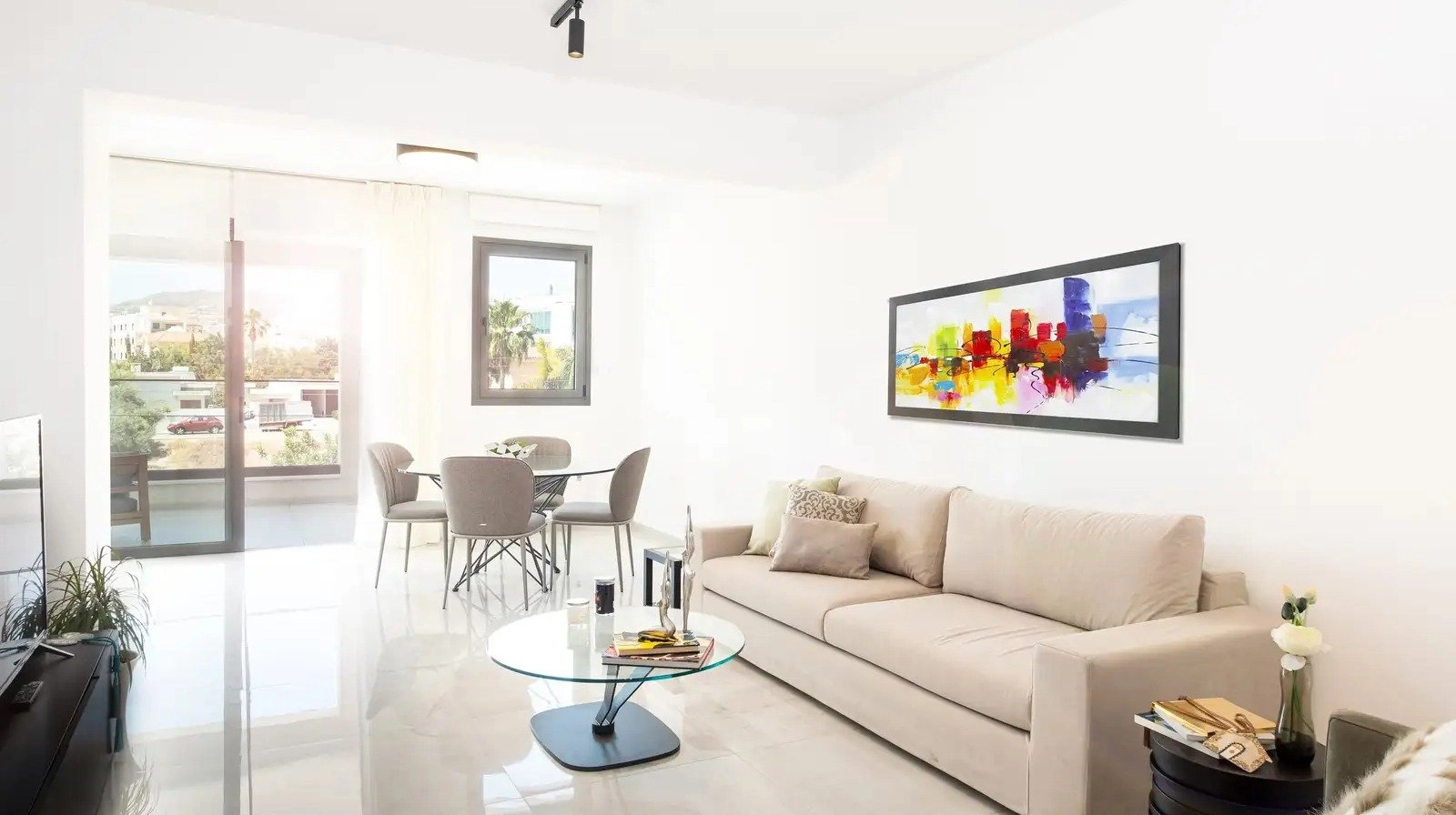 The apartment features a bright and spacious open-plan layout, combining a fully furnished living and dining area with a contemporary kitchen. Large windows allow for abundant natural light, while the seamless connection to the balcony enhances the indoor-outdoor living experience.
