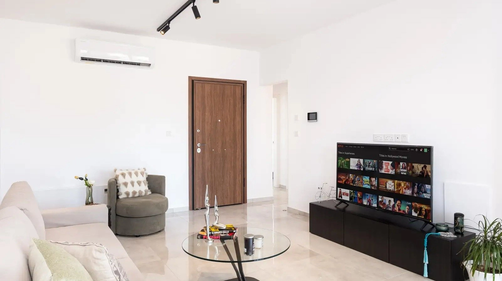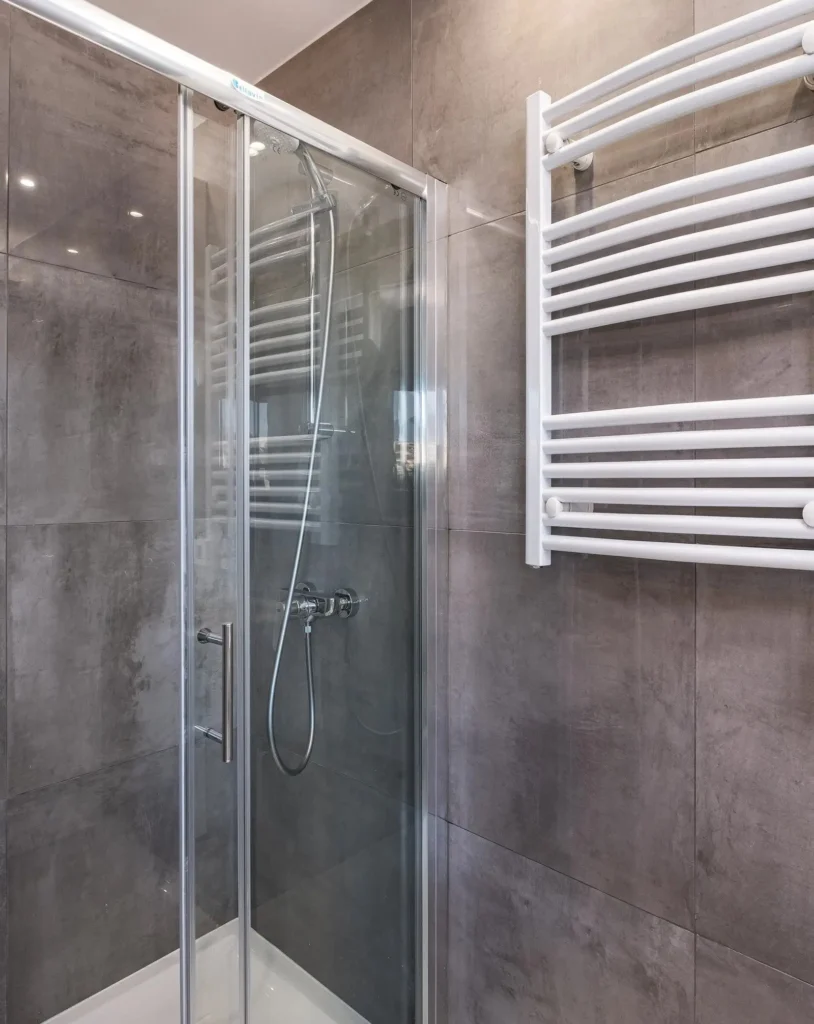 Both bedrooms are well-sized, and the apartment is fully furnished and equipped with electrical appliances, air conditioning, and heating towel rails, ensuring year-round comfort.