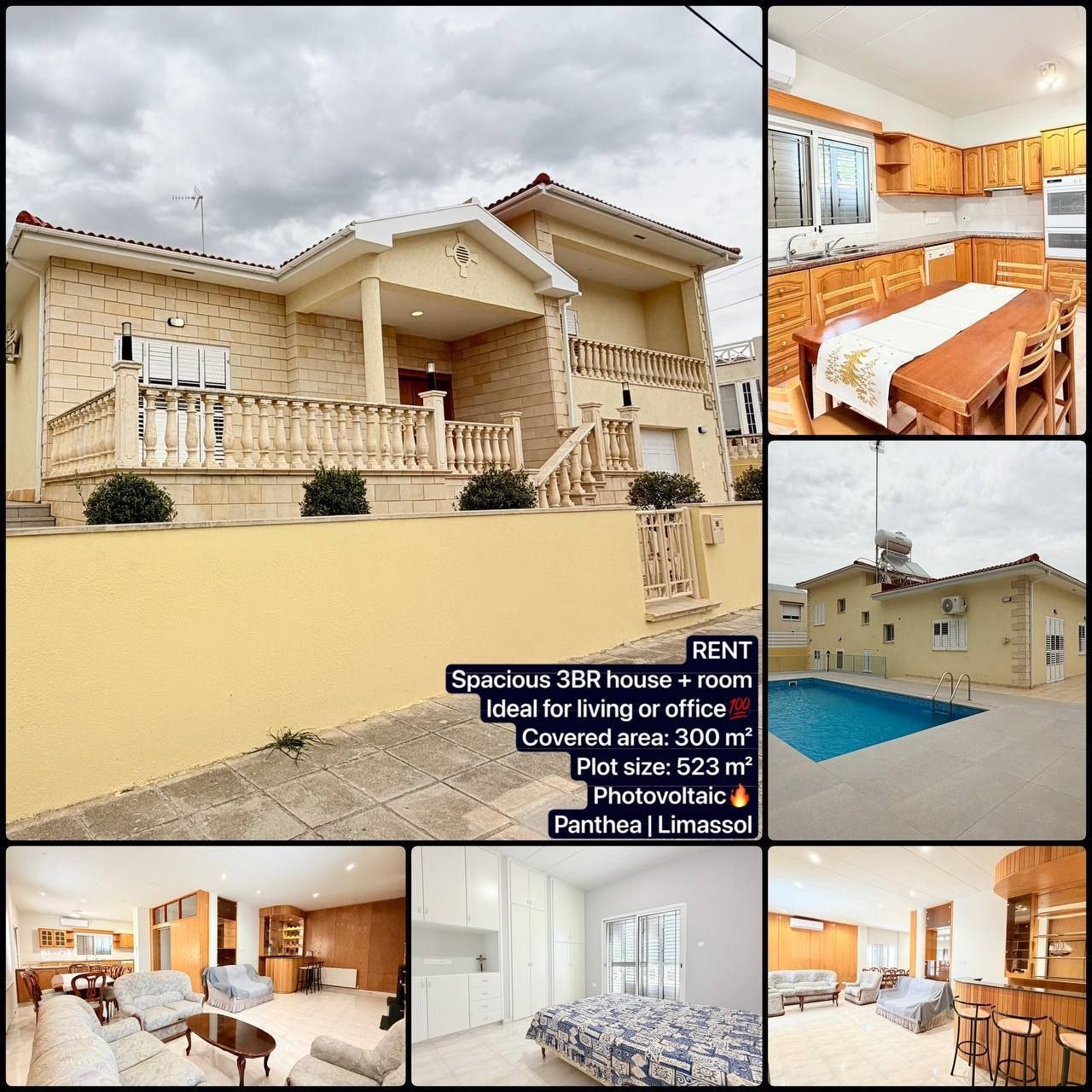 Rent. Spacious 3 bedroom house 300 sq m + study in the Panthea area, Limassol. All infrastructure and beach within a 6-minute drive, not far from Grammar School. Can be rented as an office! 2 levels. After renovation. Living area: 300 sq m. Plot area: 523 sq m. Kitchen. Living room. 3 bedrooms. Bathrooms: 3. Balcony. Study. Veranda. Extra separate guest room with shower. Diesel heating. Garden. Pool. Parking for 6 cars. Photovoltaics, electricity bills will be inexpensive. Electric car charging. Price: 4,250. Agency CULPRO ESTATES Ltd L.N 197/E R.N 1189 +357 95109900 +357 95592209 H304