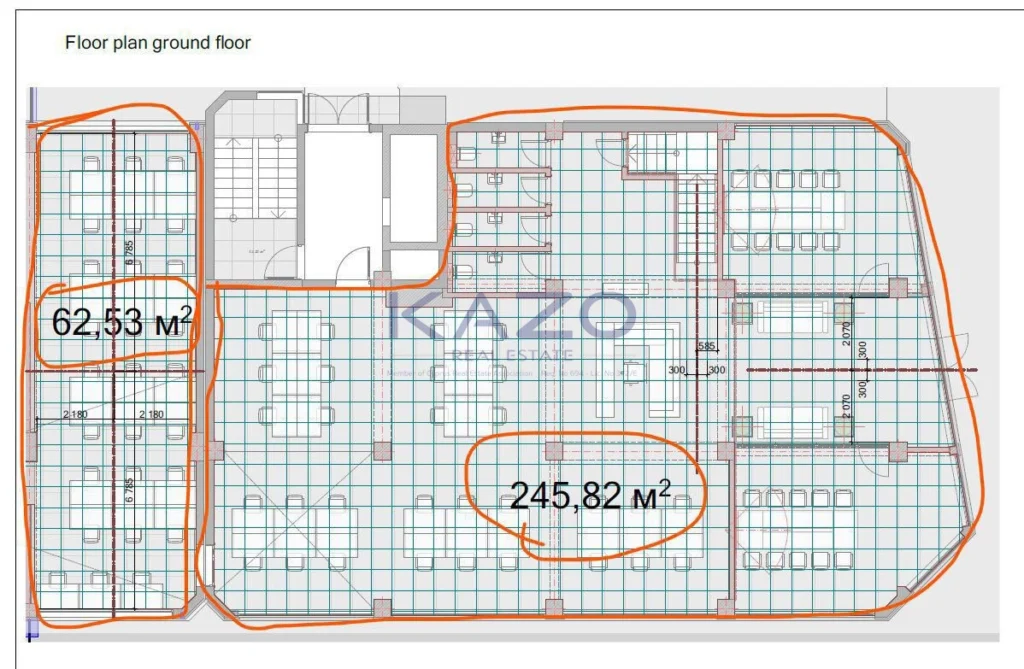 Available for rent, this spacious office offers a total internal area of 308 square meters, situated on the ground floor for easy access and convenience. The property features a well-designed layout, providing ample space for workstations, meeting rooms, and collaborative zones. Large windows allow plenty of natural light, creating a comfortable and productive working environment. With a modern central air conditioning system in place, your team and clients will enjoy consistent comfort throughout the year.